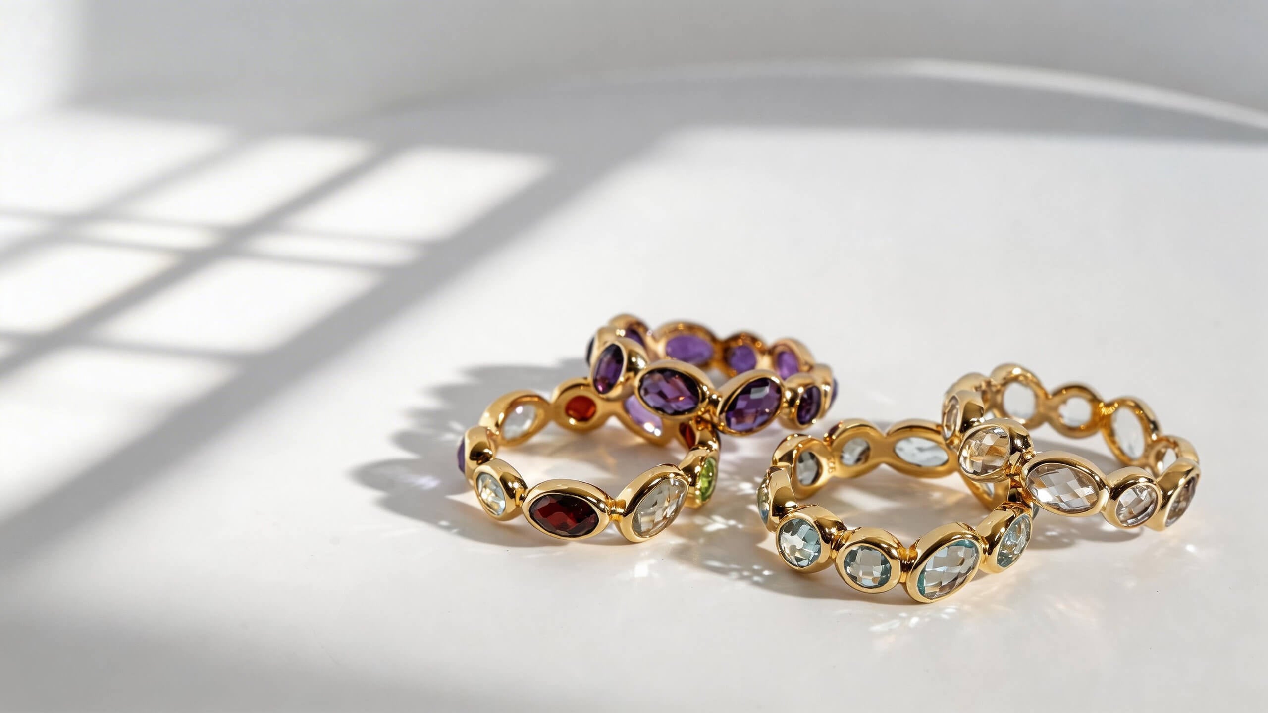 特徴:全周に天然石を配したエタニティデザイン、大粒と小粒を交互に並べたデザイン、ニッケルフリー仕様、重ね付けしやすいデザイン