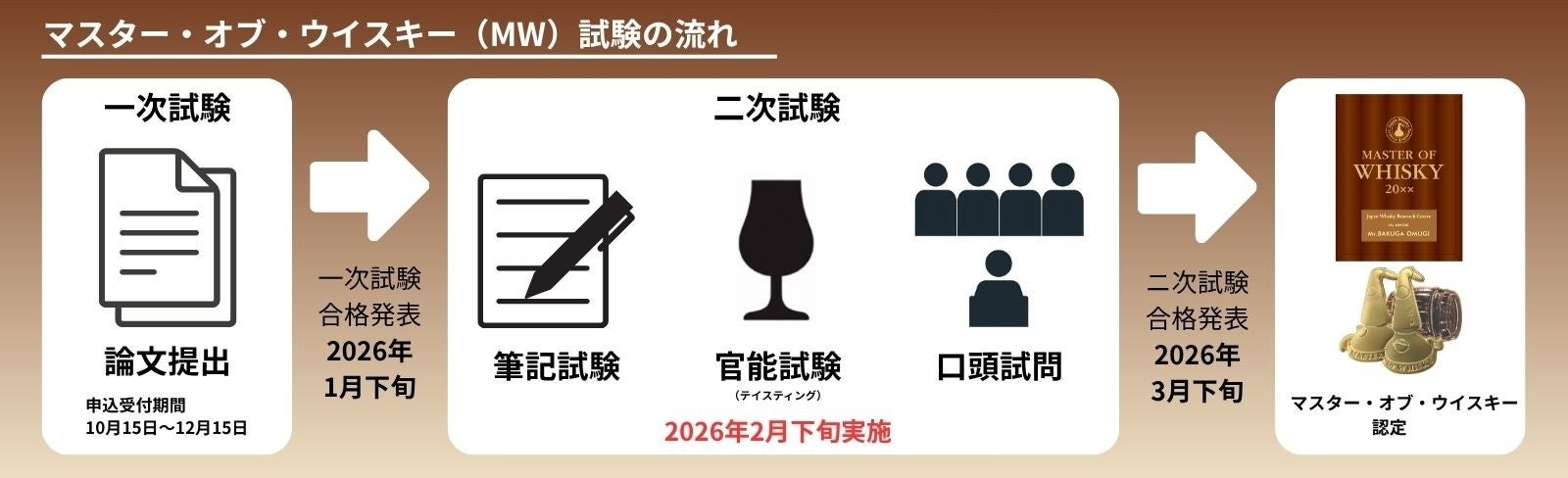 「マスター・オブ・ウイスキー」試験は、論文審査の一次試験、筆記・テイスティング・口頭試問の二次試験があり、合格発表は2026年3月下旬を予定しております。