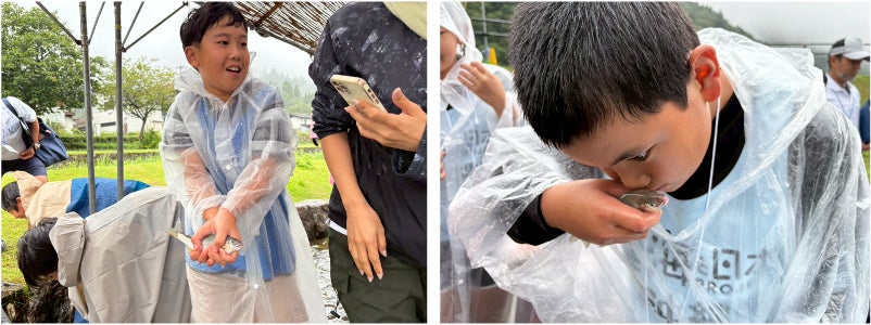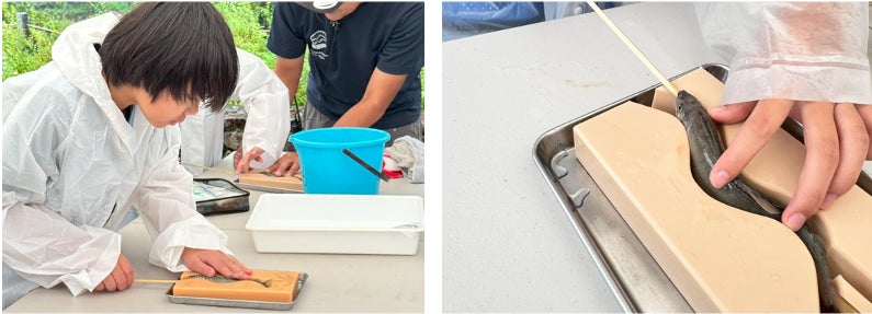 捕まえたアユは、串を刺して塩焼きにします。串打ちをするにあたり、講師を務める清流長良川あゆパーク 体験活動総支配人の後藤 克仁先生から「生きものから命をいただくこと」について話を聞きました。笑顔いっぱいのワクワクとしたつかみ取りとは雰囲気が一遍し、子ども達は真剣な表情でアユに向き合い、串を打ちました。魚を捕まえるとはどういうことなのか、他の命が食べ物として私たちの命へとつながる、そのプロセスに触れ、食べ物への感謝の気持ちがリアルな感覚として心に刻まれました。