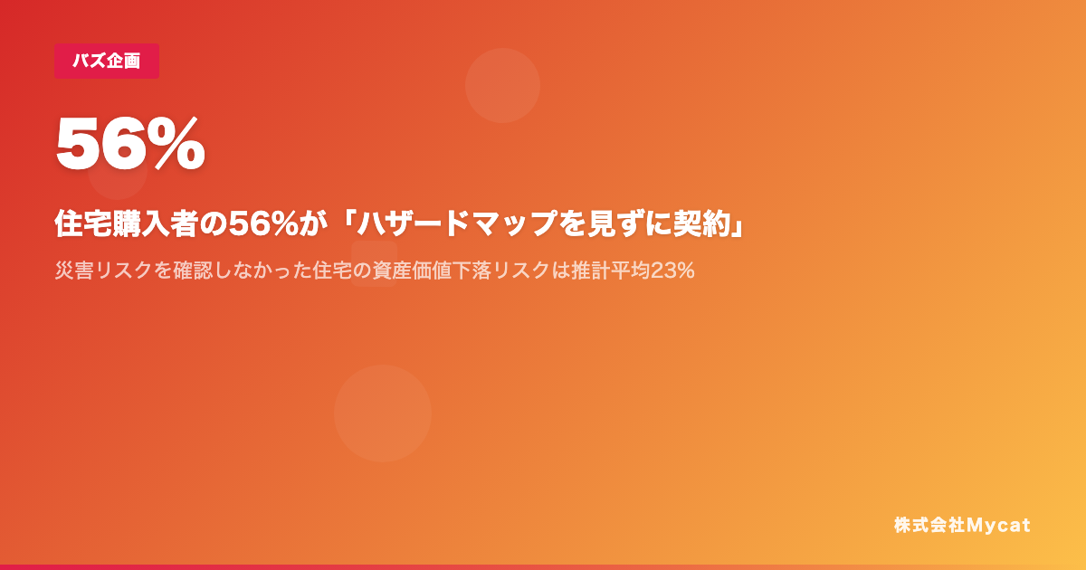 株式会社Mycat(本社:東京都目黒区)が運営するAI災害リスク診断サービス「サイガイマップ」(https://saigaimap.xyz)は、内閣府「防災に関する世論調査」と国土交通省「不動産取引価格情報」を統合分析し、住宅購入時の災害リスク確認実態と資産価値への影響に関するレポートを公開しました。