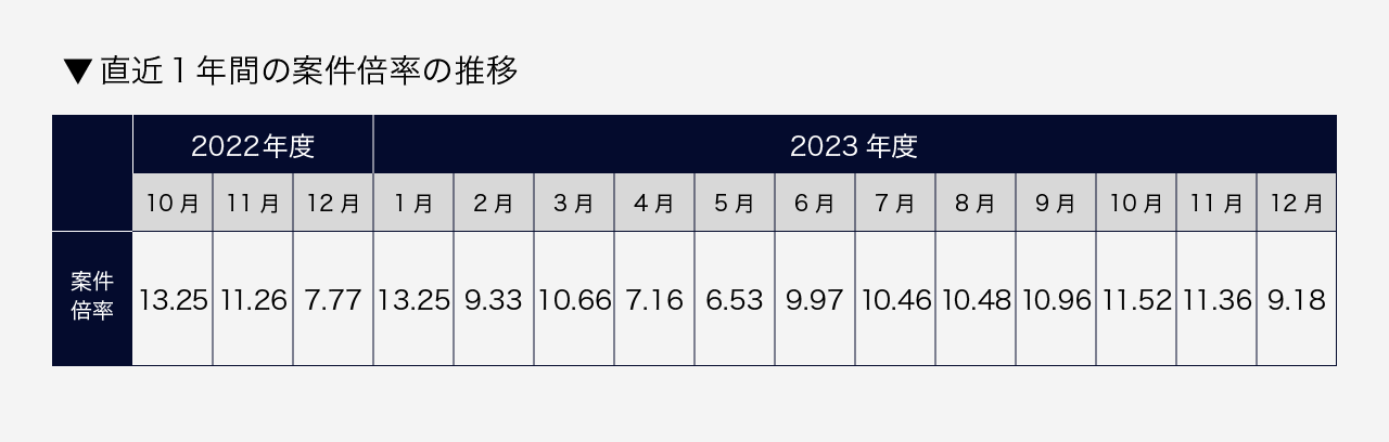 2023年10月から12月の案件倍率は、10月:11.52倍、11月:11.36倍、12月:9.18倍と推移し、四半期累計では10.67倍となりました。