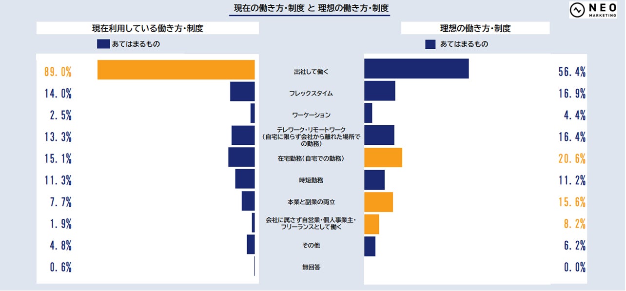 現在の働き方で89.0%の割合となった「出社して働く」は、理想の働き方となると56.4%と約半数にとどまりました。また出社以外で、現在の働き方と理想の働き方の乖離が5ポイント以上だったのが、「本業と副業の両立」「会社に属さず自営業・個人事業主・フリーランスとして働く」「在宅勤務(自宅での勤務)」でした。