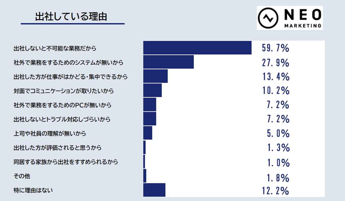 「出社した方が仕事がはかどる・集中できるから」「対面でコミュニケーションが取りたいから」等、自ら進んで出社する方がそれぞれ10%弱いる一方で、「社外で業務をするためのシステムが無いから」出社している方が約30%存在しました。また「社外で業務をするためのPCが無いから」も7.2%と、お勤め先の用意する環境が整っていないことが要因で出社する割合は多いようです。