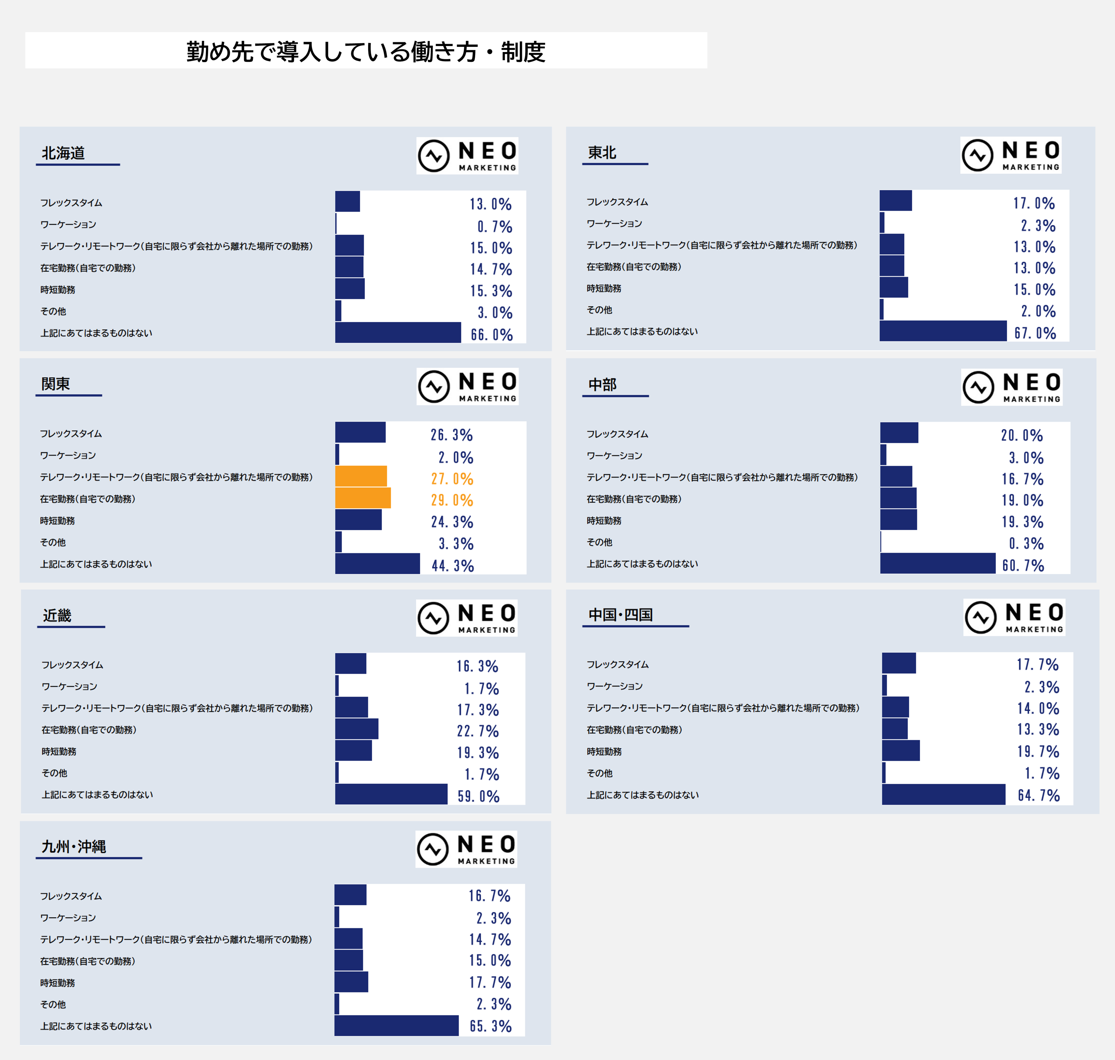 「テレワーク・リモートワーク」「在宅勤務」の導入について関東ではそれぞれ27.0%・29.0%となり、最も割合の低かった東北の13.0%・13.0%と比較してその差はそれぞれ「テレワーク・リモートワーク」で14ポイント、「在宅勤務」で16ポイントでした。