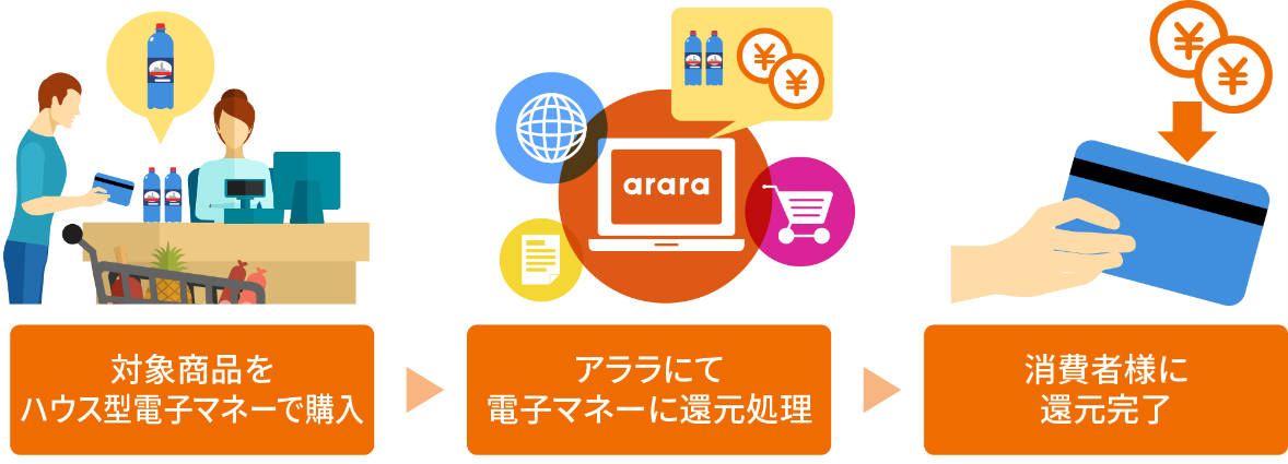 「チャージバック」は、プロモーションを実施したいメーカーと店舗をWEB上でマッチングし、店舗を利用する顧客に対しメーカーがダイレクトにアプローチできる販促支援サービスです。店舗を利用する常連客が、プロモーション対象商品をその店舗が発行するハウス電子マネーで購入すると、POSデータと連携し自動でプロモーションにエントリーされます。後日、ハウス電子マネーへプロモーション還元額が付与されます。メーカーは、管理画面からプロモーション対象商品、還元額、実施希望店舗などを選択するだけ。最短翌日から販促を開始できます。また、店舗は、プロモーションに参加することで、お客様の再来店を見込めます。