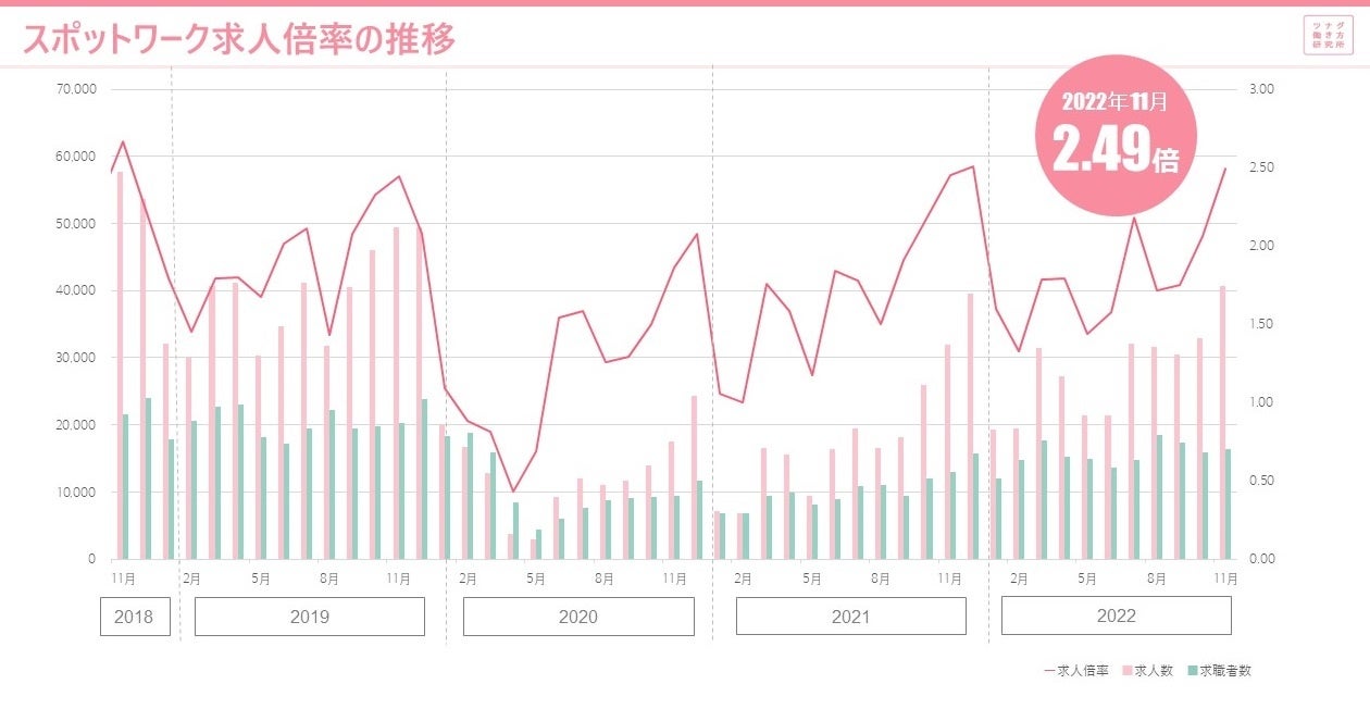 1.単発、短時間、短期間で働くスポットワークの2022年11月度求人倍率は2.49倍