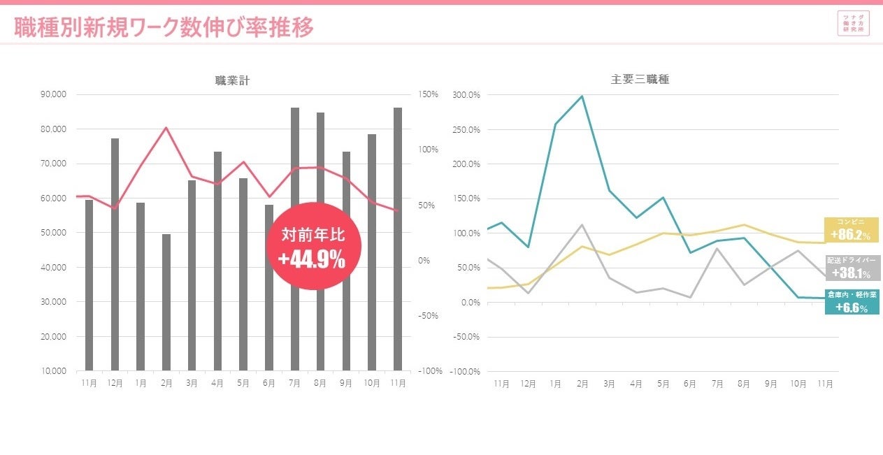2.新規ワーク数は、対前年比で+44.9%。主要職種ではコンビニスタッフが+86.2%と伸長