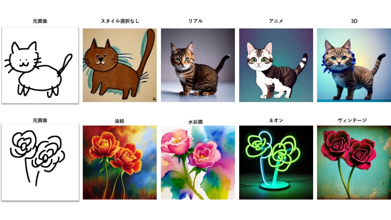 AI 落書きイラスト化は、ざっくりと描かれたラフ画を AI が精緻なイラストに変換してくれる機能です。