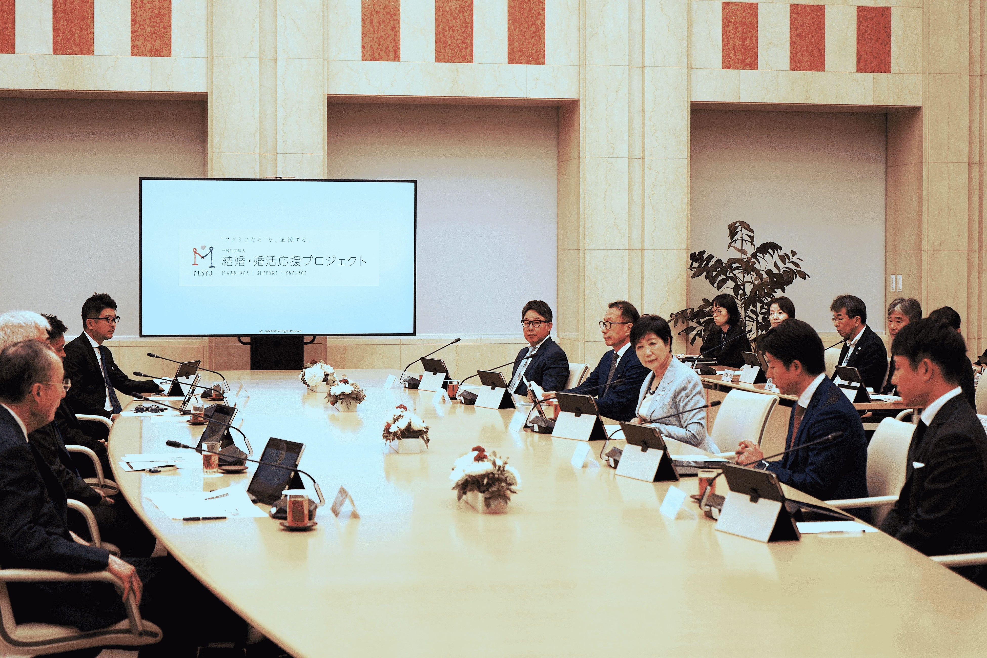 東京都は、「一人ひとりの多様な選択肢が叶えられる社会」の実現に向け、出会いから結婚、妊娠・出産、子育てまでライフステージを通じた切れ目ない支援を進めています。このたび新たに立ち上げた「結婚おうえん TOKYO ミーティング」は、婚活・結婚に躊躇している人が1歩を踏み出す勇気が持てるよう、社会全体のムーヴメントを高めるために、マッチングアプリ、結婚相談所、式場・婚礼関係等の団体が集まって議論することを目的としています。今後、年2回程度の全体会と、「マッチングアプリ」などのテーマに沿った分科会が実施される予定としており、キックオフミーティングの位置付けで6月10日に開催された第1回全体会には、小池百合子都知事とMSPJのほか、日本結婚相手紹介サービス協議会、日本ブライダル文化振興協会、未来ウェディングJAPANから計8名が出席しました。