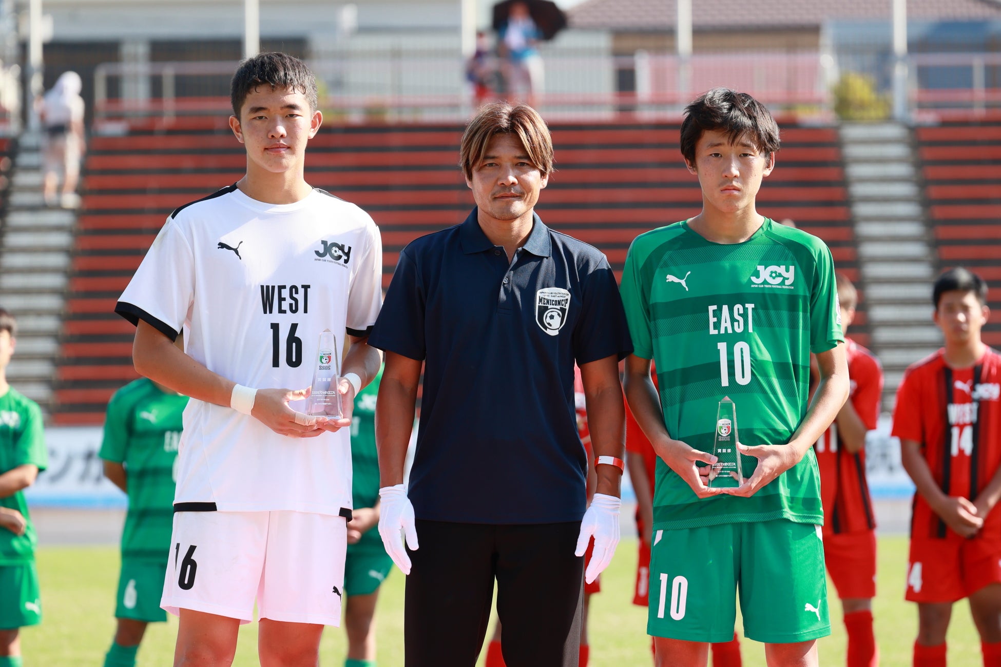 試合は2-2の同点でPK戦の末、ALL WESTがALL EASTに勝利し、ALL WESTは前回大会に続いての勝利となりました。最優秀選手賞には、WEST13番、MF 八色真人選手(名古屋グランパスU-15)、敢闘賞にはEAST10番 MF前田勘太朗選手(横浜FCジュニアユース)、WEST16番 GK田中皓惺選手(サガン鳥栖U-15)が選出されました。最優秀選手賞に選ばれた八色選手は、「地元なので、1点でもいいから点をとりたいという気持ちでプレーしました。」とのコメントを残しました。