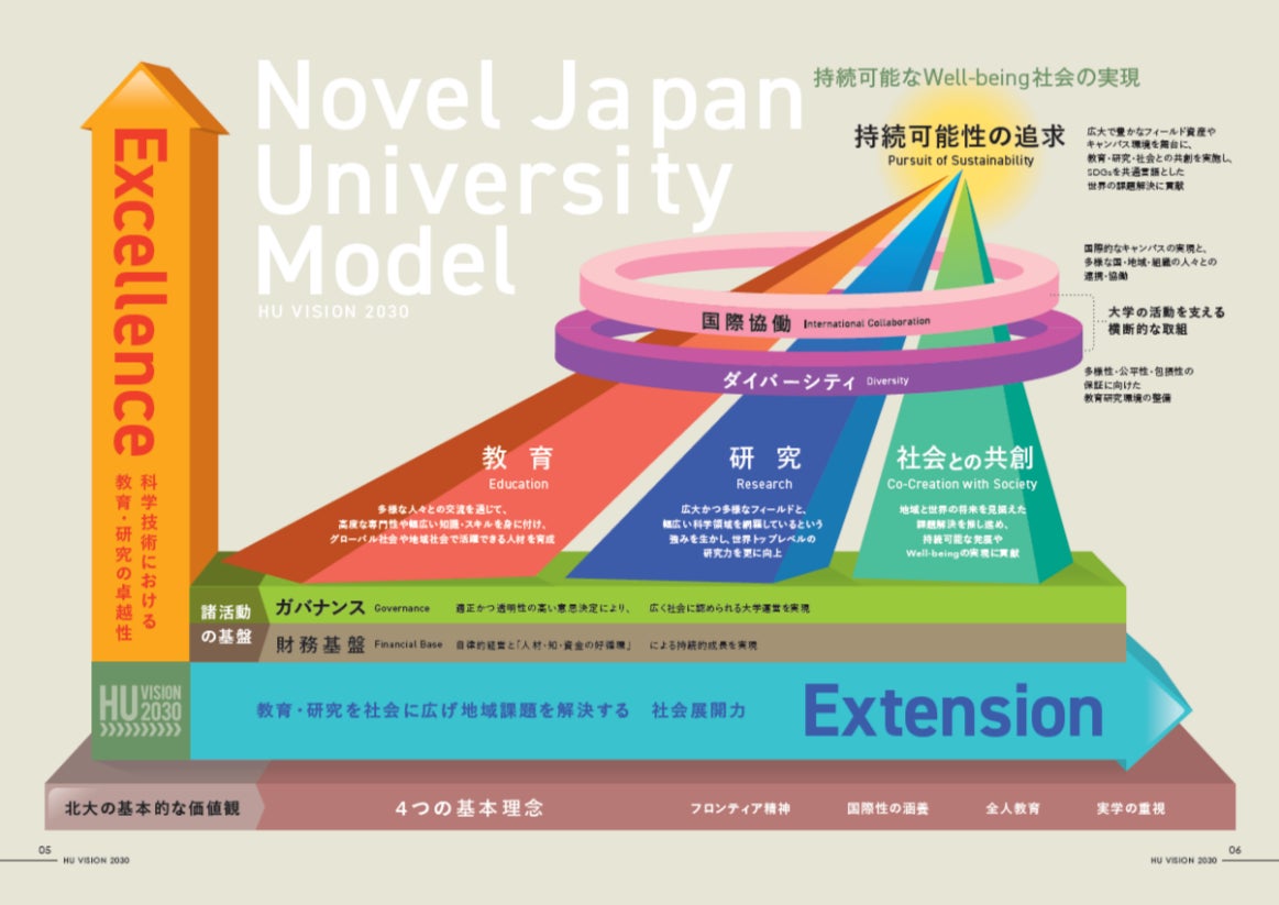 一方、北海道大学はHU VISION2030を掲げ、教育・研究を社会に広げ、地域課題の解決に貢献する社会展開力の強化を進めています。地域と世界のニーズに対応すべく、自治体、企業、他大学等との協働体制を強化し、課題解決に資する知の創出および人材育成を加速させるとともに連携の繋がりを地域から世界へ広げることに注力しています。