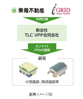 株式会社アイ・グリッド・ソリューションズ(本社:東京都千代田区、代表取締役社長:秋田 智一、以下「アイ・グリッド」)と東急不動産株式会社(本社:東京都渋谷区、代表取締役:星野 浩明、以下「東急不動産」)はこのほど、非FIT※1のオンサイトPPA※2を共同で開発・推進するための新会社「TLC VPP合同会社(本店:東京中央区八丁堀四丁目2番10号AOJ税理士法人内、代表社員:STF一般社団法人)を設立いたしましたのでお知らせいたします。今回の提携では、アイ・グリッドのPPAモデル国内No.1※3実績と東急不動産の持つ再エネ開発力という強みを持つ2社で設立した新会社が、再エネ電気の送電距離が短く効率の良いオンサイト太陽光PPA事業を迅速に共同開発することで、再エネ電気の地産地消を実現し、企業の課題となっている脱炭素化の取り組みに協力してまいります。
