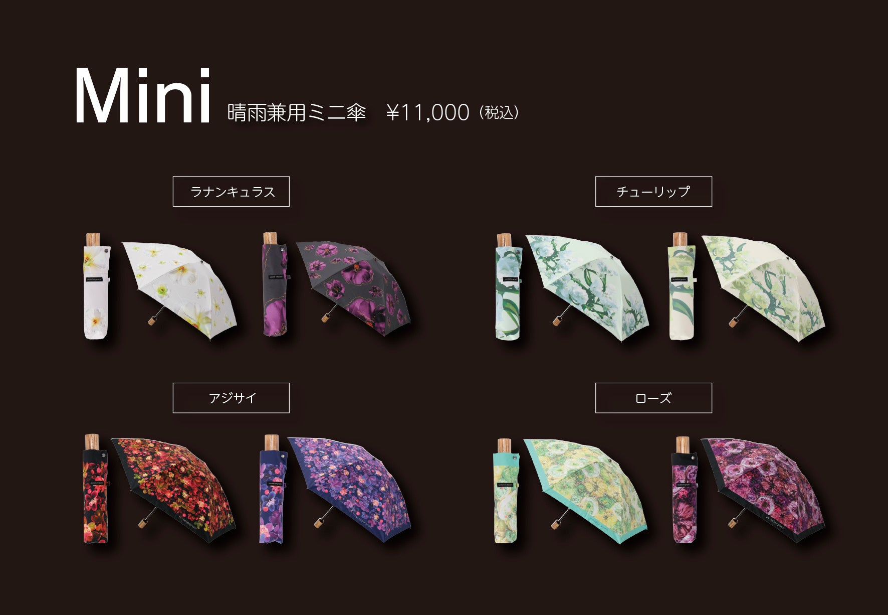 遮光、遮熱、UVカットの機能を備えていて、強い紫外線が降り注いだり、突然の雨が多い春夏シーズンに活躍します。持ち歩きやすいショートタイプとミニタイプの傘をご用意しました。