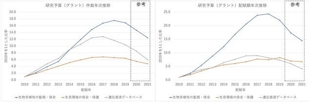 図に示すように、2010年以降、「生物多様性の監視・保全」に関するグラント件数、配賦額が急激に伸びていることがわかり、2018年には2010年と比較して20倍以上まで増加していることがわかりました。