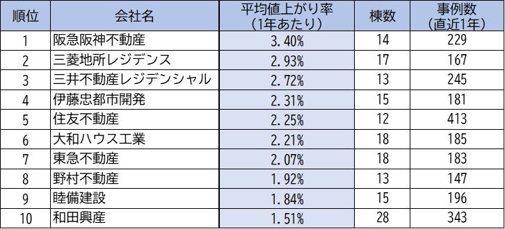 本調査は、2009年以降に竣工した関西圏の新築分譲マンションを対象に各住戸の新築分譲時の価格と、2021年10月から2022年6月までの間に中古マンションとして売り出された価格の値上がり率を算出し、2022年10月迄の経過年数で除算することで年間当たりの値上がり率を算出し、ランキングしています。少数事例による誤差を抑制するため、総戸数30戸未満のマンションならびに上記期間の事例数が5件以下のマンションを除外し、それらを除いた事例が11棟以上のサンプルがあるデベロッパーを対象としています。