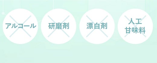 〈デンタルホワイト〉はデンタルケアでは難しかったノンアルコール処方を含む、研磨剤フリー、漂白剤フリー、人工甘味料フリーと4つのフリー処方に加え、ヒノキチオール*⁷、マスティック*⁸、グリチルリチン酸2K*⁹などの口内環境を整える成分も配合し、お口にやさしいマイルド処方にこだわりました。