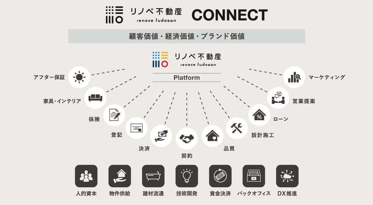 「中古仲介+リノベーション」のワンストップサービス市場シェアNO.1*の「リノベ不動産」は、資金計画・不動産仲介・リノベーションの設計デザイン・施工・イン テリア・アフターまでのワンストップサービスを展開するプラットフォーム。本部では、リノベーションWEBメディア「リノベ不動産ドットコム」や、業界特化型CRM・MAツール、業務プロセスを効率化する統合基幹情報システム「リノベ不動産cloud」など、最新テクノロジーを活用した「中古仲介+リノベーション」の各種ノウハウ・セールスプロセス・WEBマーケティング・デザイン供給・建材提供・アフターコンテンツ提供、また業界特化型システム開発するなど、DX推進に注力し顧客体験価値の向上を図っています。 産業構造上の課題を解決し、業界都合のサービスでなく、顧客ファーストなサービス提供を実現するソリューションを事業者向けに展開しています。