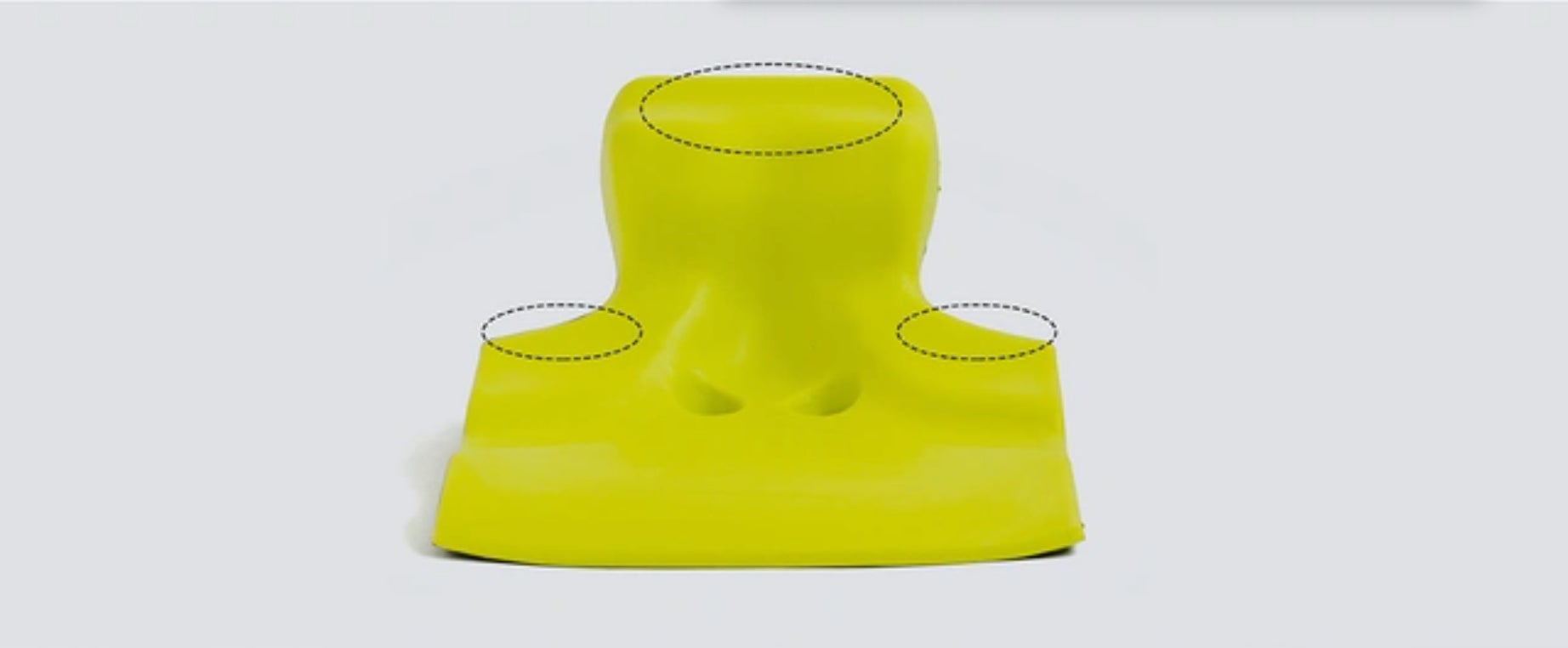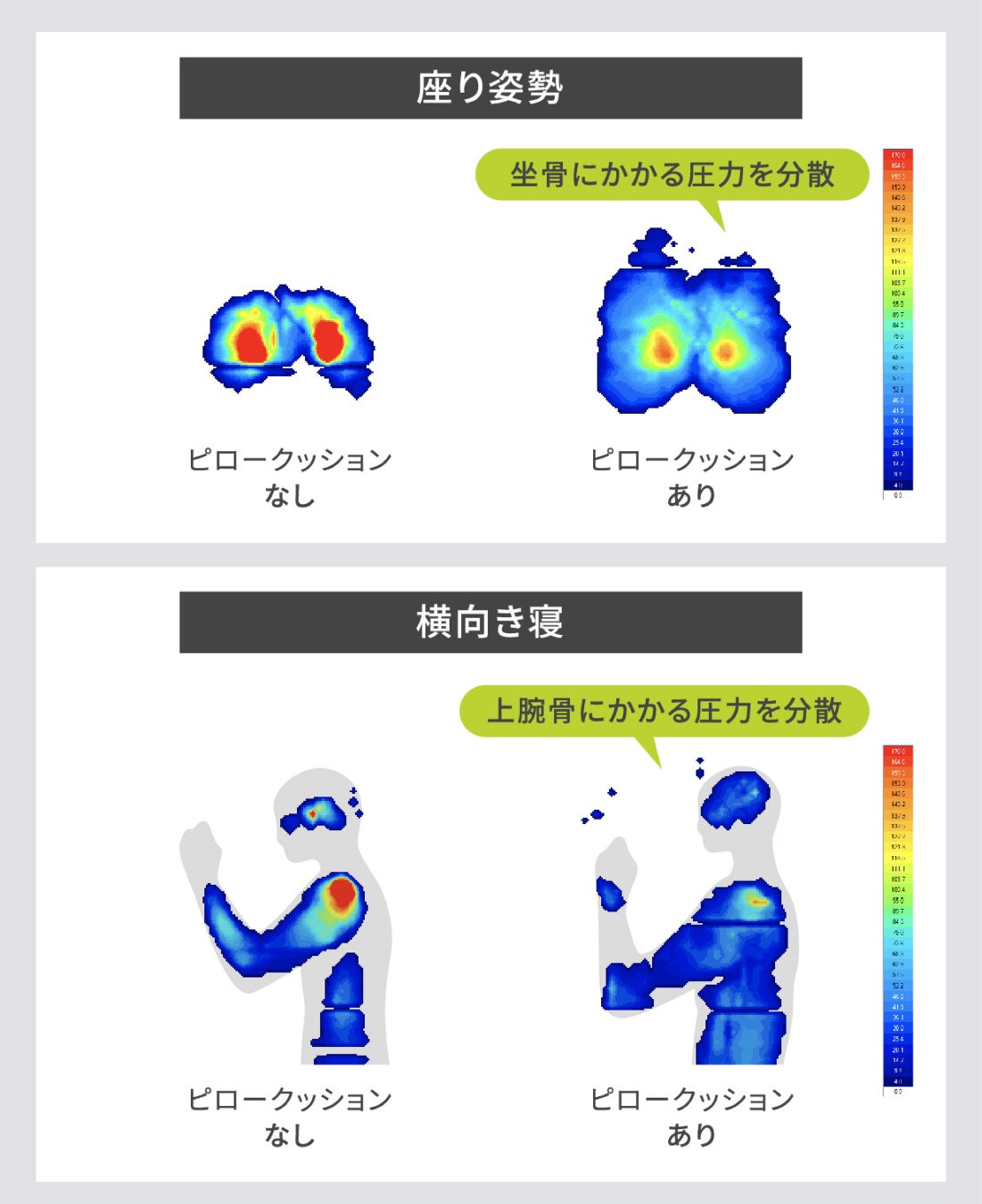 下図の通り、座り姿勢、横向き寝ともに、ピロークッションなしだと一点が常に赤く、極端に体重がかかっていることがわかります。ピロークッションを使用すると、赤い部分が少なくなり、圧力が集中することなくバランスよく体重を支えられます。