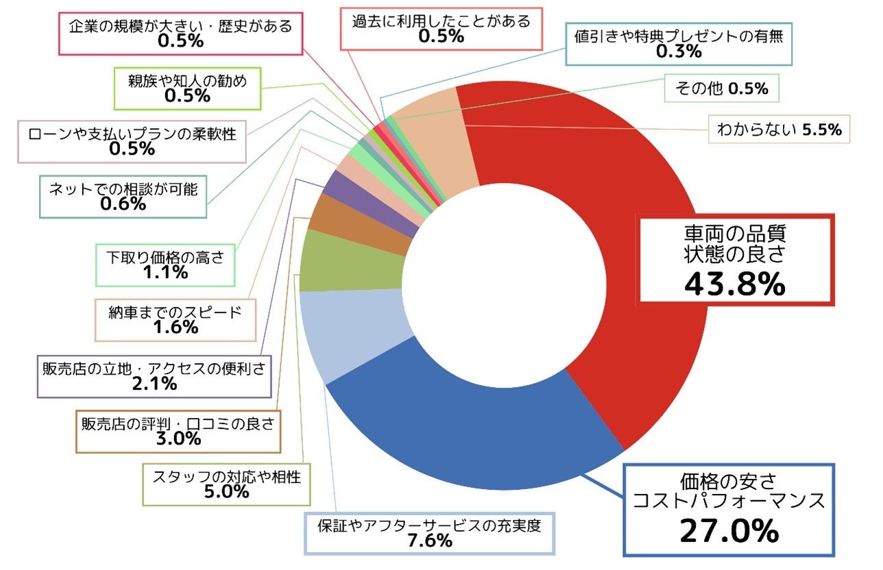車を購入する際に最終的に最も重要な決め手となるものを聞いたところ、「車両の品質・状態の良さ」が43.8%でトップ、「価格の安さ・コストパフォーマンス」が27.0%で続く結果となりました。中古車購入においては、品質と価格が重視されていることがわかりました。