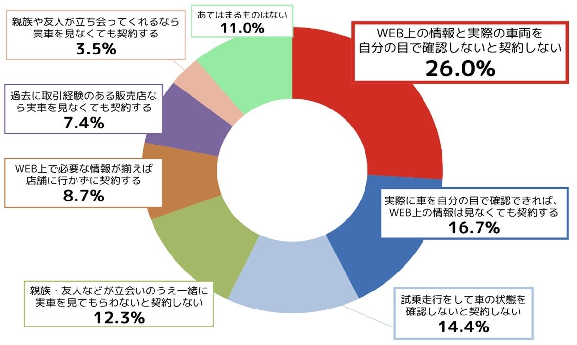 中古車を購入するときの意思決定の仕方について聞いたところ、「WEB上の情報と実際の車両を自分の目で確認しないと契約しない」が26.0%、「実際に車を自分の目で確認できれば、WEB上の情報は見なくても契約する」が16.7%、「試乗走行をして車の状態を確認しないと契約しない」が14.4%という結果となりました。従来のように実際に車両を確かめ、試乗をしないと契約しないという人が多い中で、「WEB上で必要な情報が揃えば、店舗に行かずに契約する」が16.7%とWEB上の情報だけで、購入を決定する人が一定数いることもわかりました。