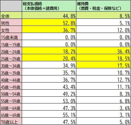 性別で見てみると、「総支払価格(本体価格+諸費用)」を選んだ割合は男性が52.8%、女性は36.7%と開きのある結果となりました。年代別で見ると「総支払価格(本体価格+諸費用)」を選んだ割合は20代前半が18.2%、20代後半が20.4%と平均を大きく下回る結果となりました。また、20代~30代前半までは「維持費(燃費・税金・保険など)」を選んでいる人の割合が多い結果となりました。このような結果から、女性と20代は総支払価格もさることながら維持費を重視していることがわかりました。