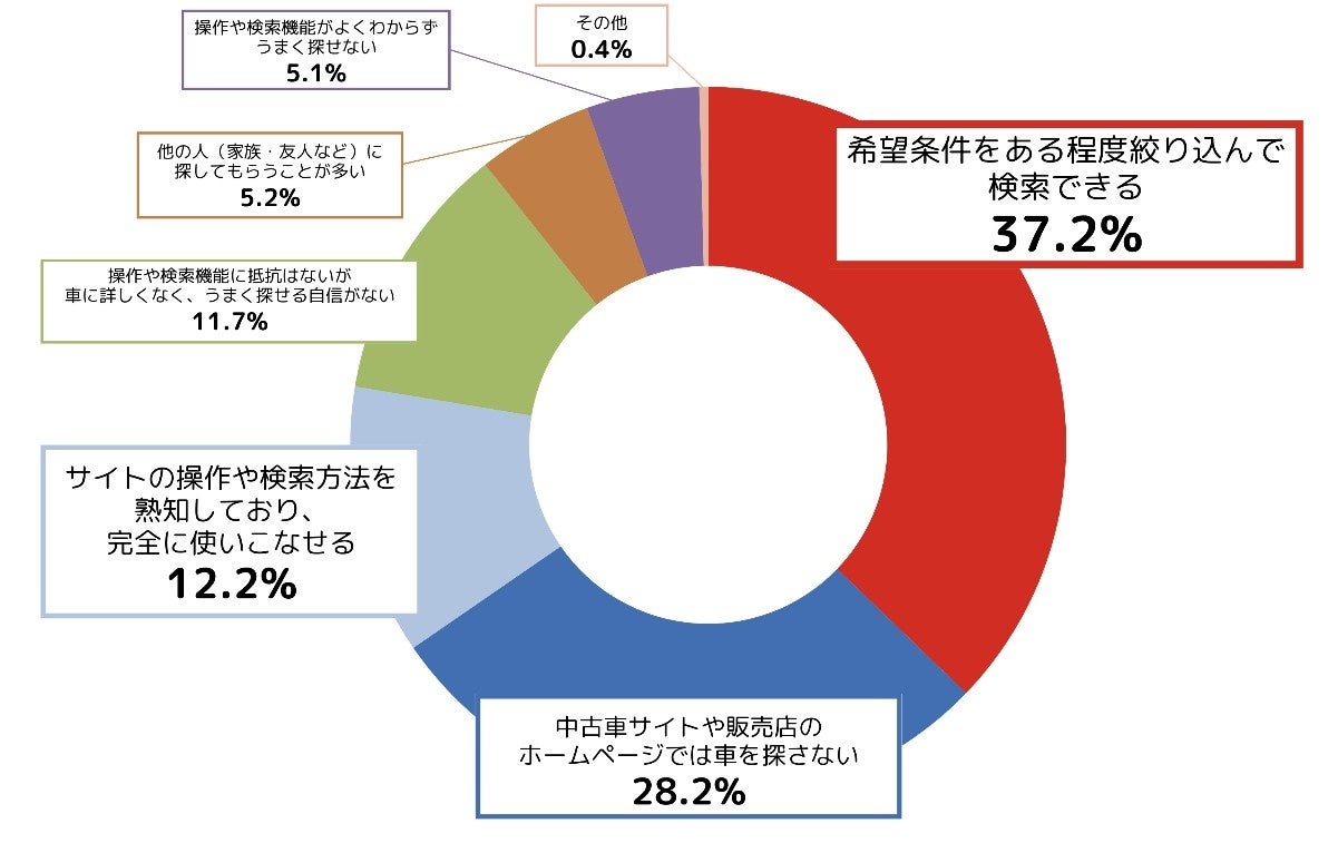 中古車サイトや販売店のホームページでの検索方法について聞いたところ、「希望条件をある程度絞り込んで検索できる」が37.2%、「中古車サイトや販売店のホームページでは車を探さない」が28.2%、「サイトの操作や検索方法を熟知しており、完全に使いこなせる」が12.2%という結果となりました。