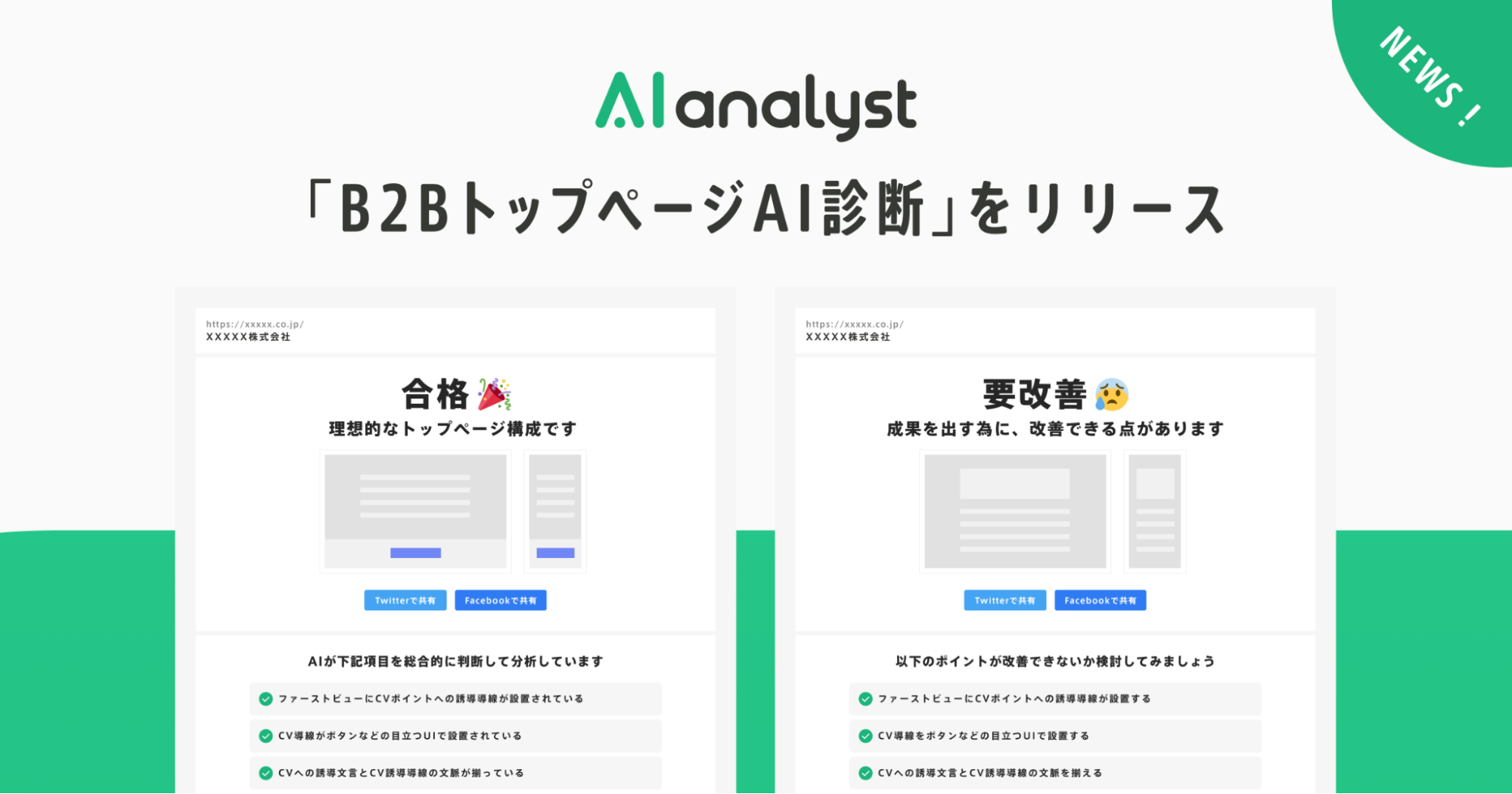 業界初、人工知能がサイトを評価する「B2BトップページAI診断」を無料提供開始。URL入力をするだけで、AIが「合格」「要改善」を1分で判定、改善点も提案。