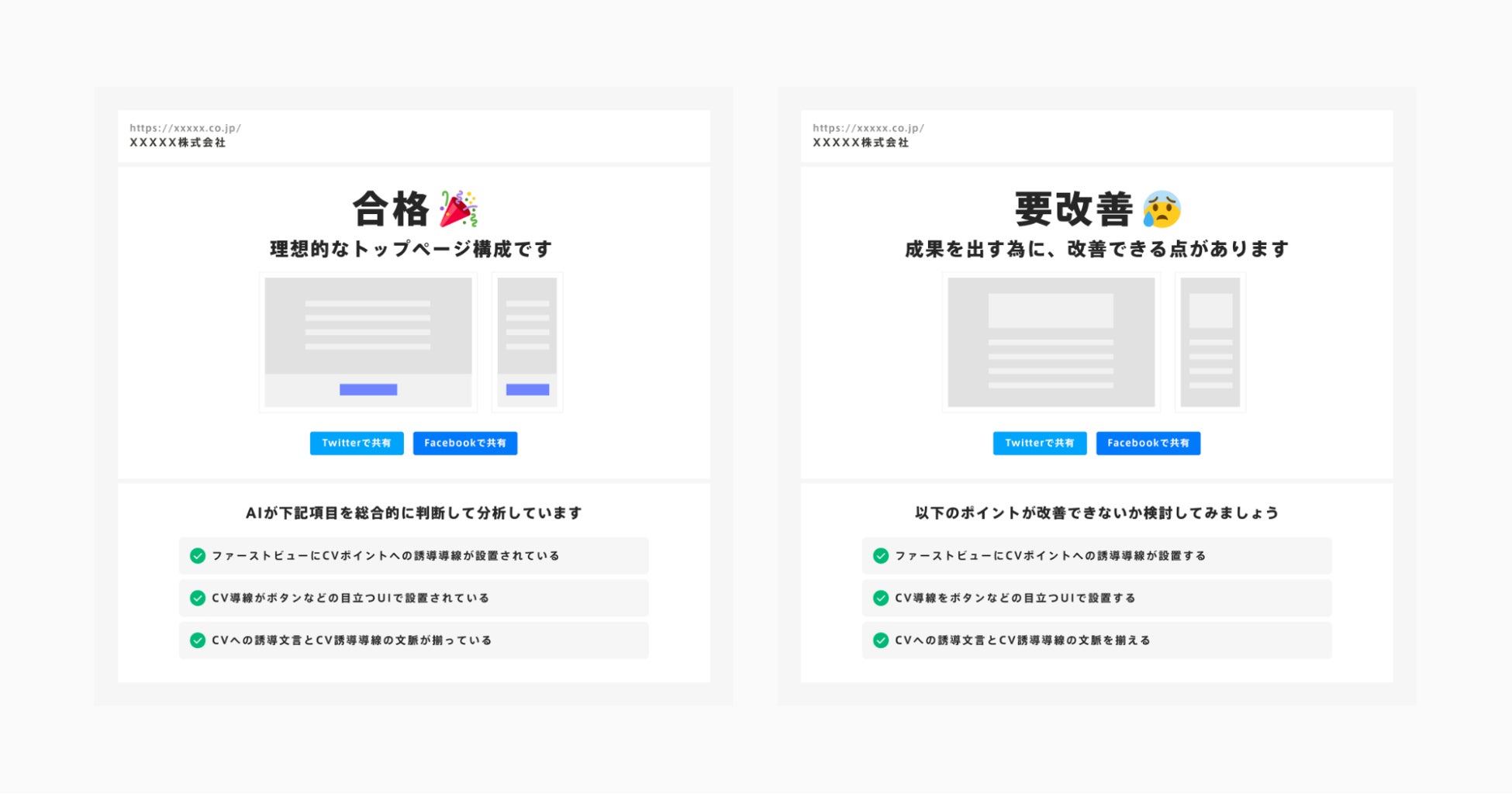 AIがトップページの情報を取得し、勝ちパターンに適合しているかを自動で判定します。判定結果は「合格」「不合格」のいずれかが表示されます。