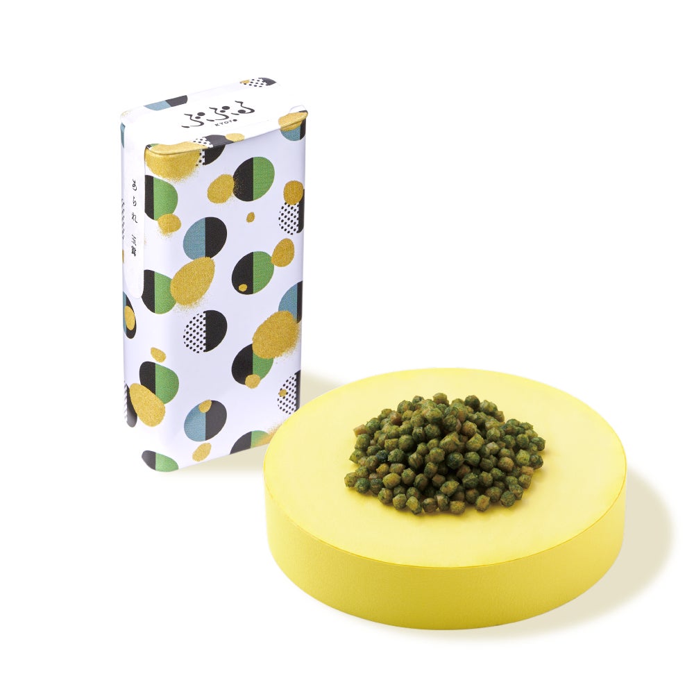 京都のお茶漬けに使われる「ぶぶあられ」のあられに、玉露パウダーをまとわせた、ぽりぽりと食べ進めたくなるスナックタイプののようなあられです。ぶぶるオリジナルミニ缶に詰められていますので、いつでもどこでも