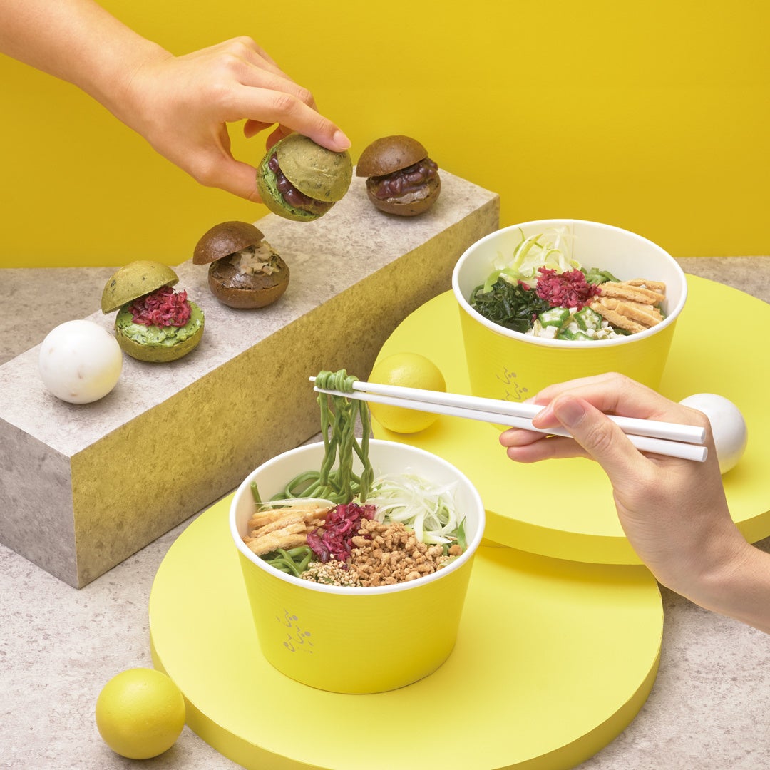 茶葉を練り込んだ特製のパンに、すっきりとした後味をもつ植物性のソイバターを挟んだ「ぶぶるさんど」。定番のあんバター(玉露、ほうじ茶)や、新幹線の“ちょっとした、贅沢おつまみ”としても嬉しい「お漬物」を組み合わせた「玉露ガーリックしば漬け」や「ほうじ茶ガーリックすぐき」の味わいが楽しめます。また持ち帰りやすさも配慮されたヌードルには玉露つゆが使用され、ここでしか味わえないテイクアウト「フード」をご提供しています。