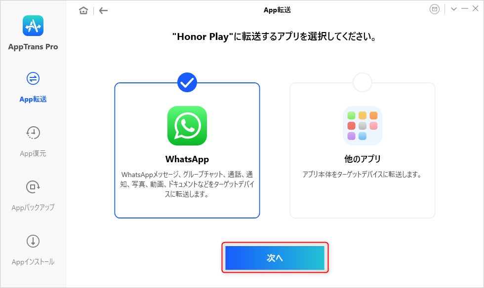 Step3、「App転送」をクリックし、転送したいアプリを選択し、「次へ」ボタンをクリック