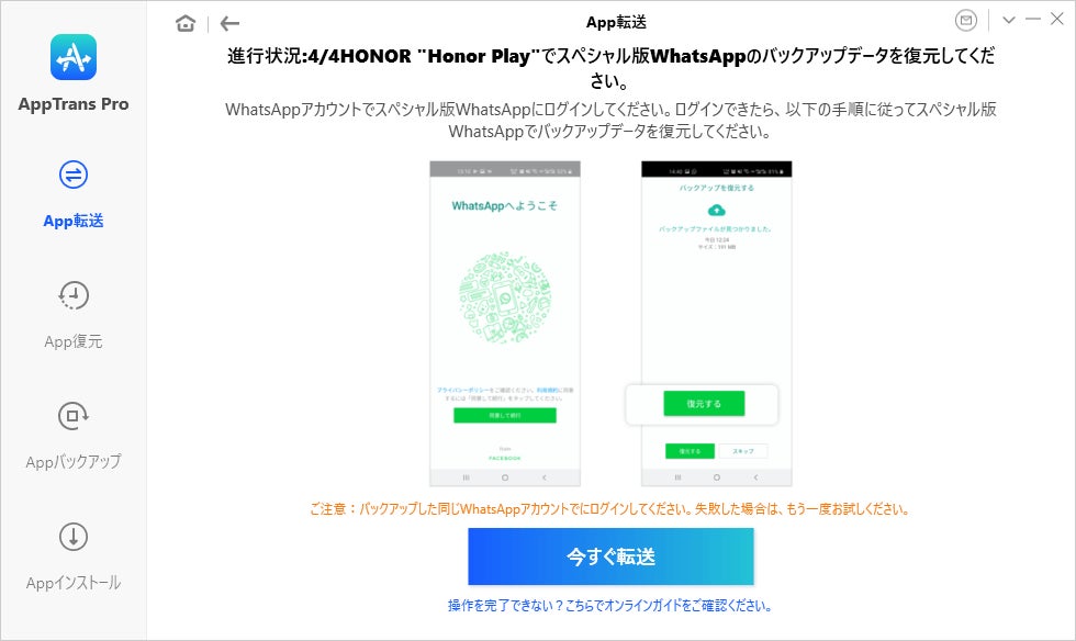 Step4、画面の指示に従って、アプリをバックアップします。バックアップが完了でしたら、「今すぐ転送」をクリックします。AppTransはAndroidデバイスからiPhoneにアプリを転送します。転送する時間はメッセージの量によって異なります。