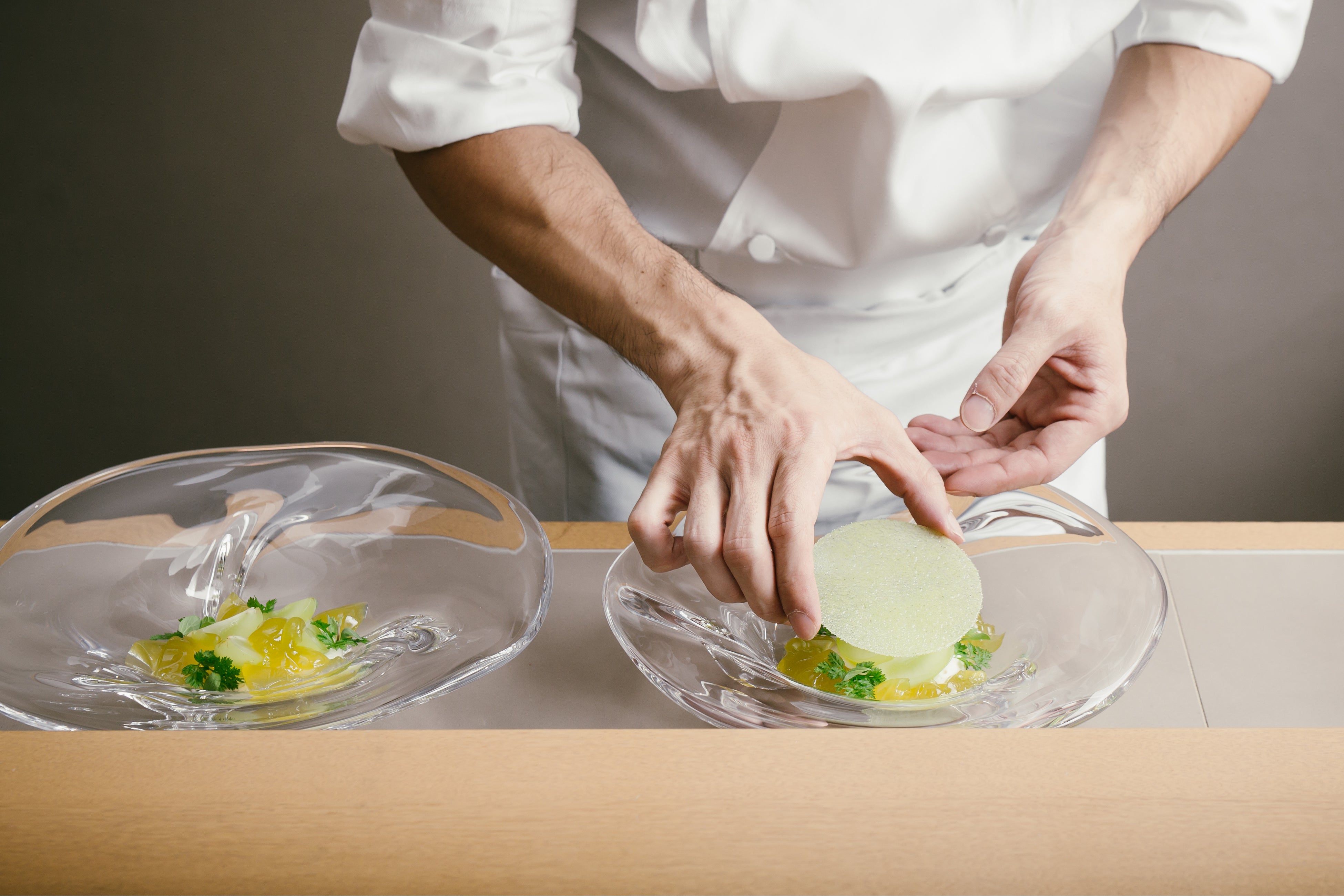 伝統的な手法を踏まえ、様々な素材・味の組み合わせや驚きを織り交ぜた美味しいお菓子には、“特別な体験として記憶に残ってほしい”という2人の想いが込められています。原材料へのこだわりや、繊細な香りをお楽しみいただけるような演出など、2人のパティシエが日々大切にしている“職人の妙”を感じられるコラボレーションデザートコースを、ペアリングのドリンクとともにお楽しみください。