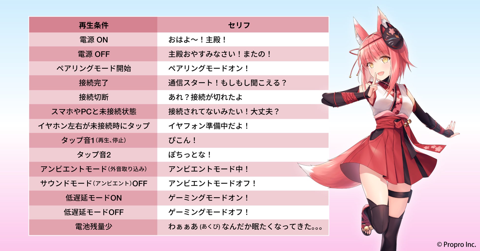 ワイヤレスイヤフォンのデザインでは、「咲夜あずさ」を象徴とする手裏剣と桜、花札をイヤフォンにデザインしました。右のイヤフォン本体には、式神のきつねのシフォンちゃんをモチーフにしています。また、パッケージのデザインは、お誕生日を記念した描き下ろしイラストになります。