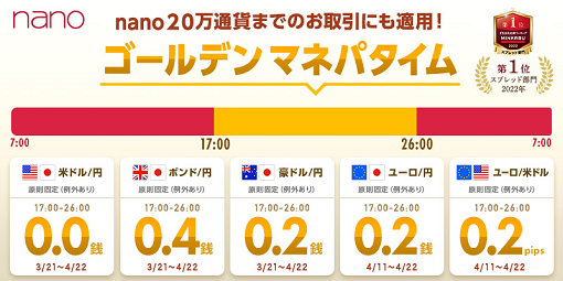 - 【nano】20万通貨までのお取引でも17時~26時は業界最狭水準スプレッドでお取引のチャンス!