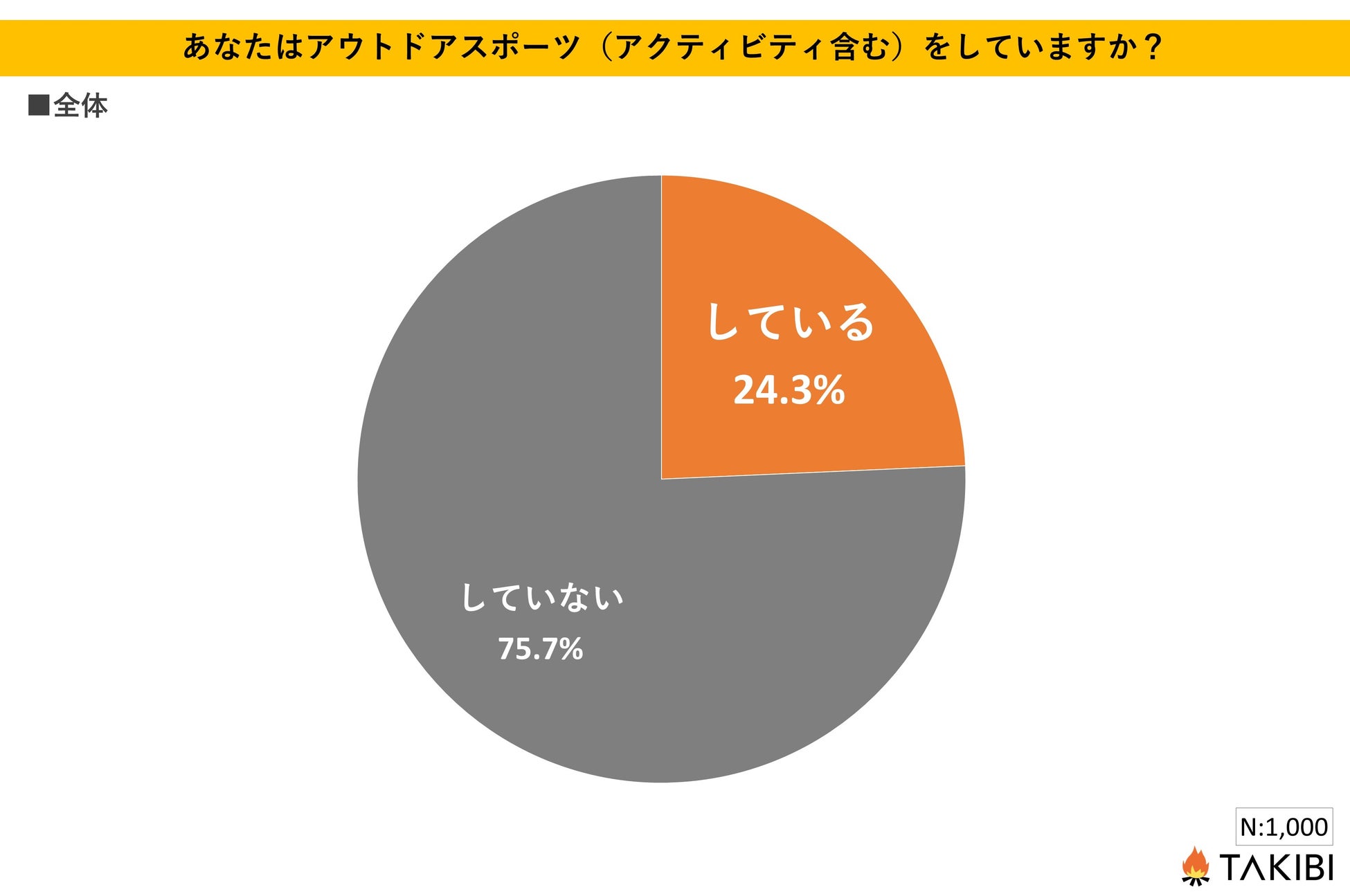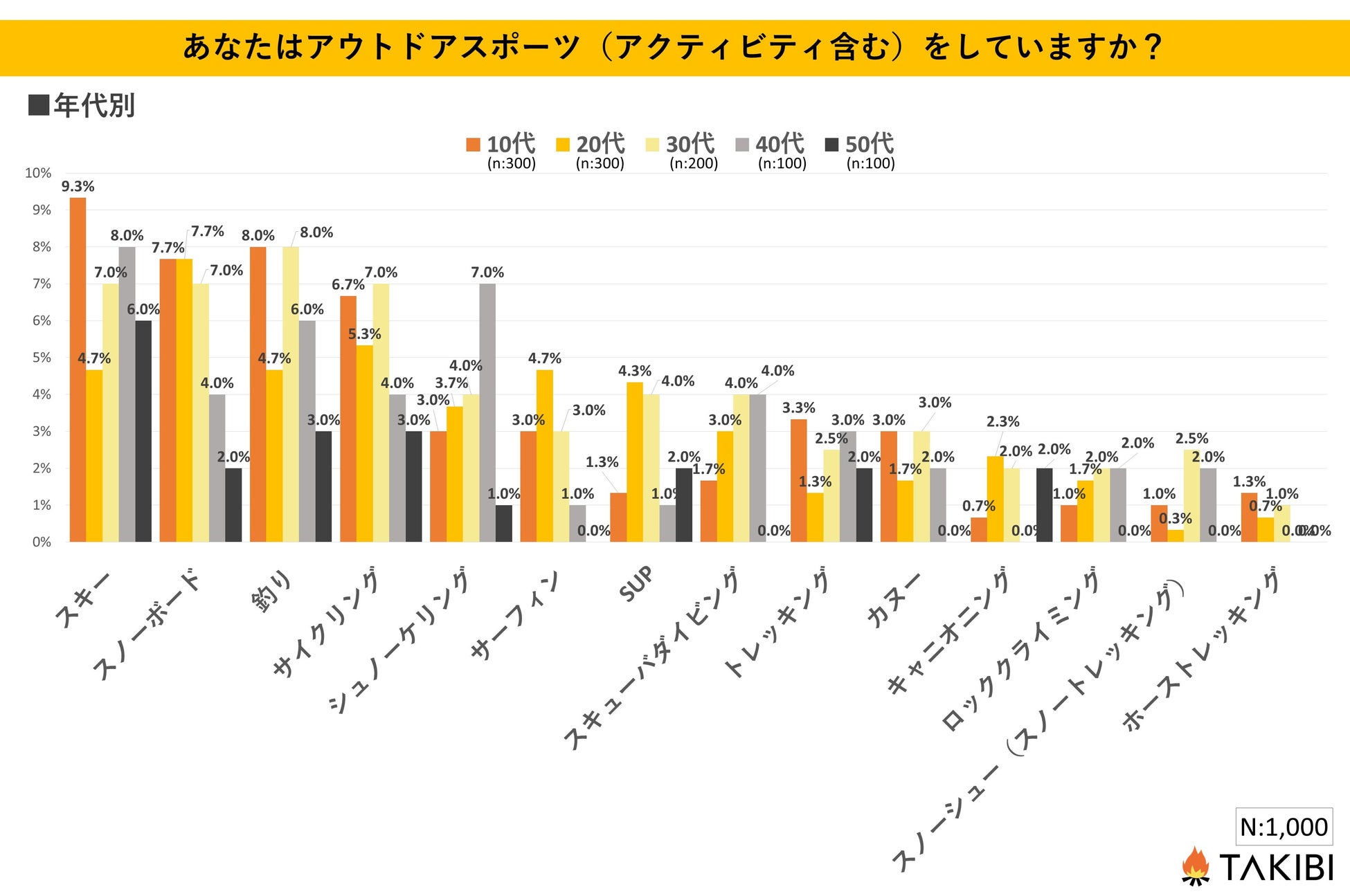 キャンプやグランピングを中心としたアウトドア総合情報サイト「TAKIBI」の運営をおこなう株式会社フォーイットは、全国の10代~50代までの男女1,000人を対象にアウトドアスポーツに関するアンケートを実施し、男女別・年代別等の特徴についてまとめました。