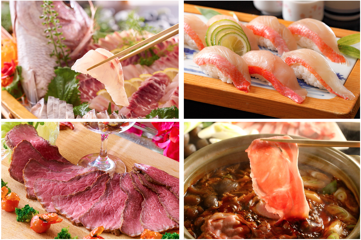 舟盛りでご提供する鯛のお造りや、じっくりと火入れすることでしっとりとした身が楽しめる自家製ローストビーフはもちろん、「上州名物 豚すき焼き」を是非ご賞味ください。甘辛の割下で豚肉やたっぷりの野菜を煮込んだ熱々メニューは、上州群馬で古くから親しまれてきたご当地の美味しさです。