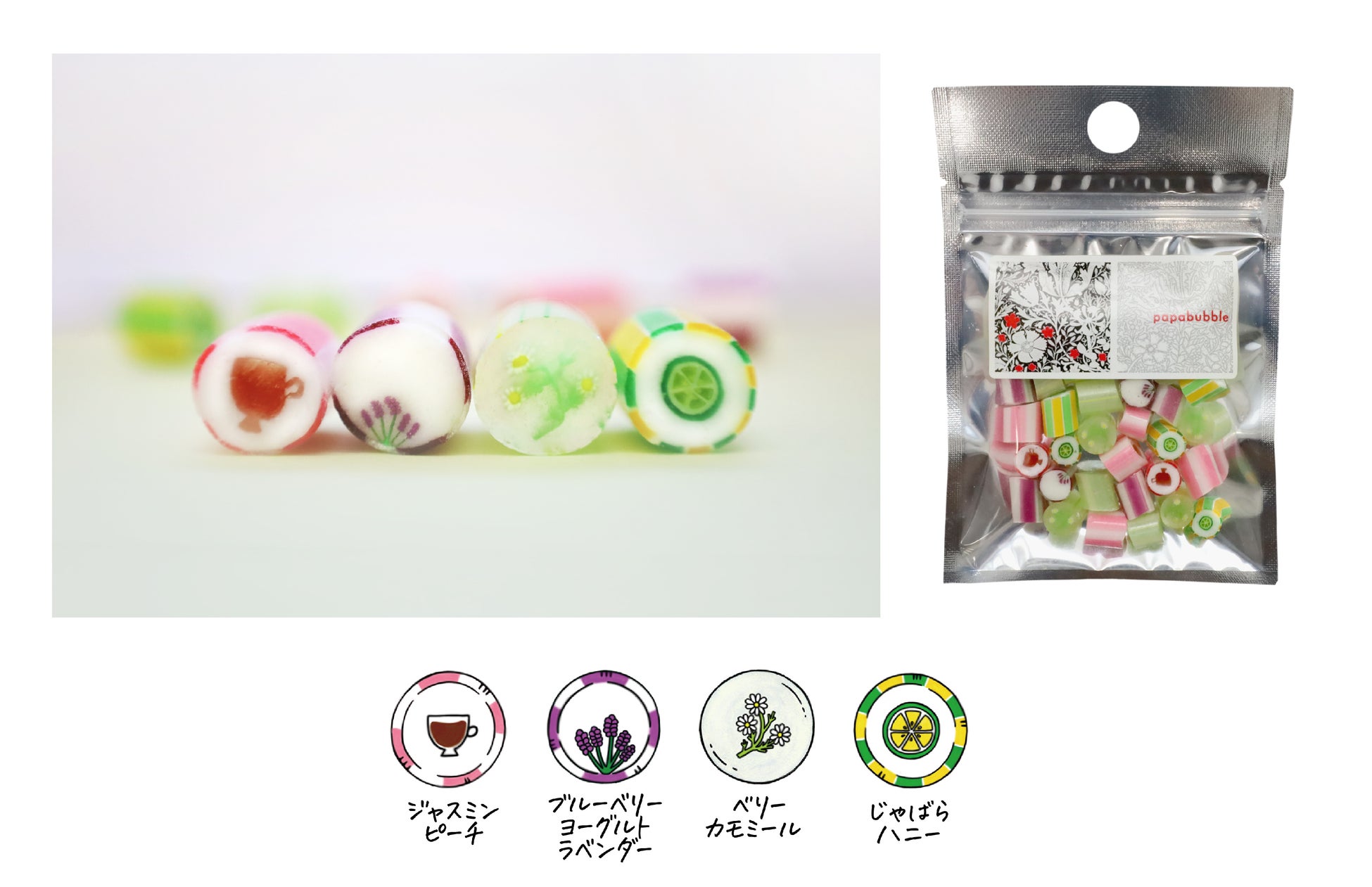 人気のじゃばらハニーをはじめ、ベリーカモミールやジャスミンピーチなど、のどが喜びそうなフレーバーを使用しながら、純粋にキャンディの味も楽しめるようにしました。