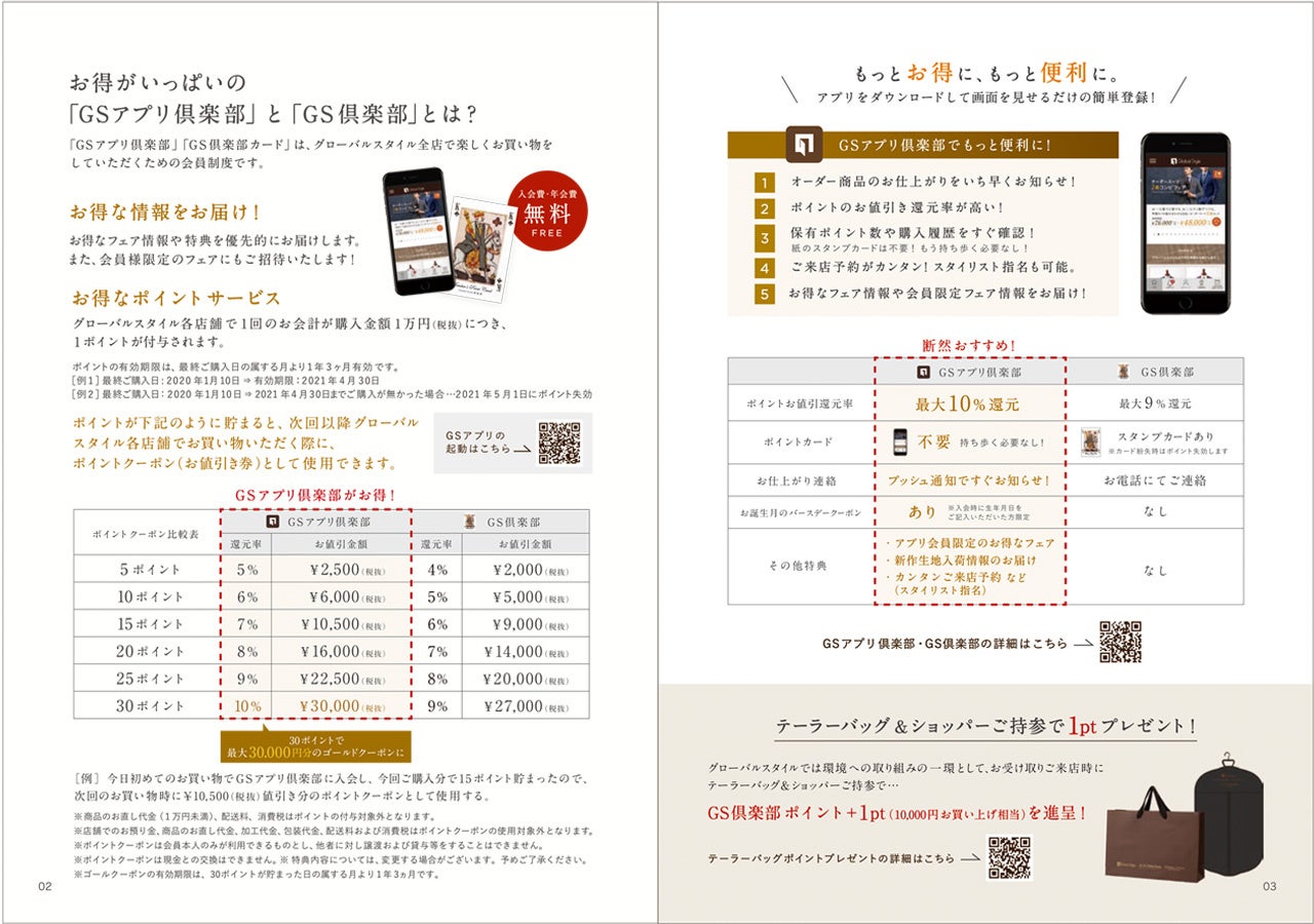 このパンフレットでは、グローバルスタイルの会員様がご利用いただけるサービス、お得なポイント制度のみならず、スーツのお手入れ情報やスタイルブックなどを豊富にご案内しております。