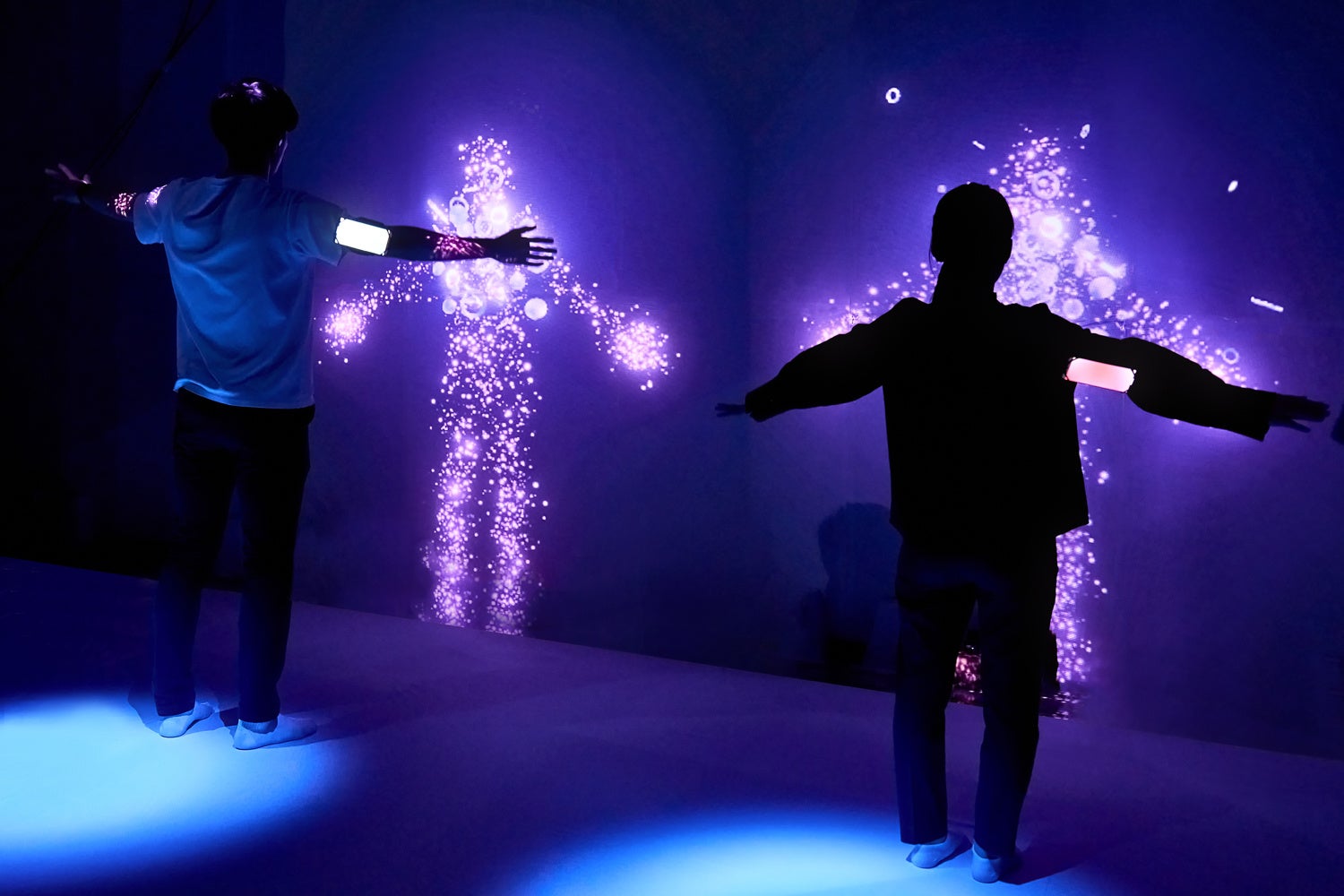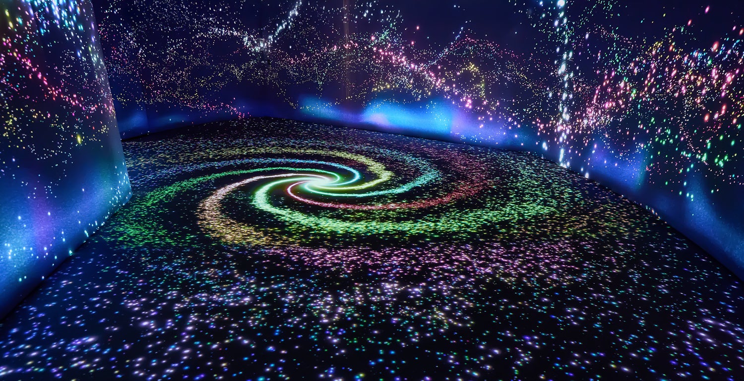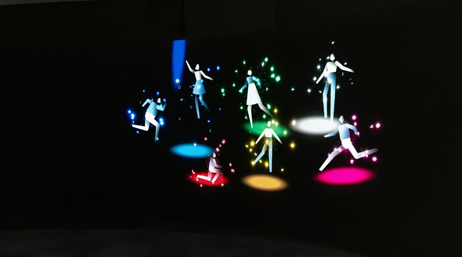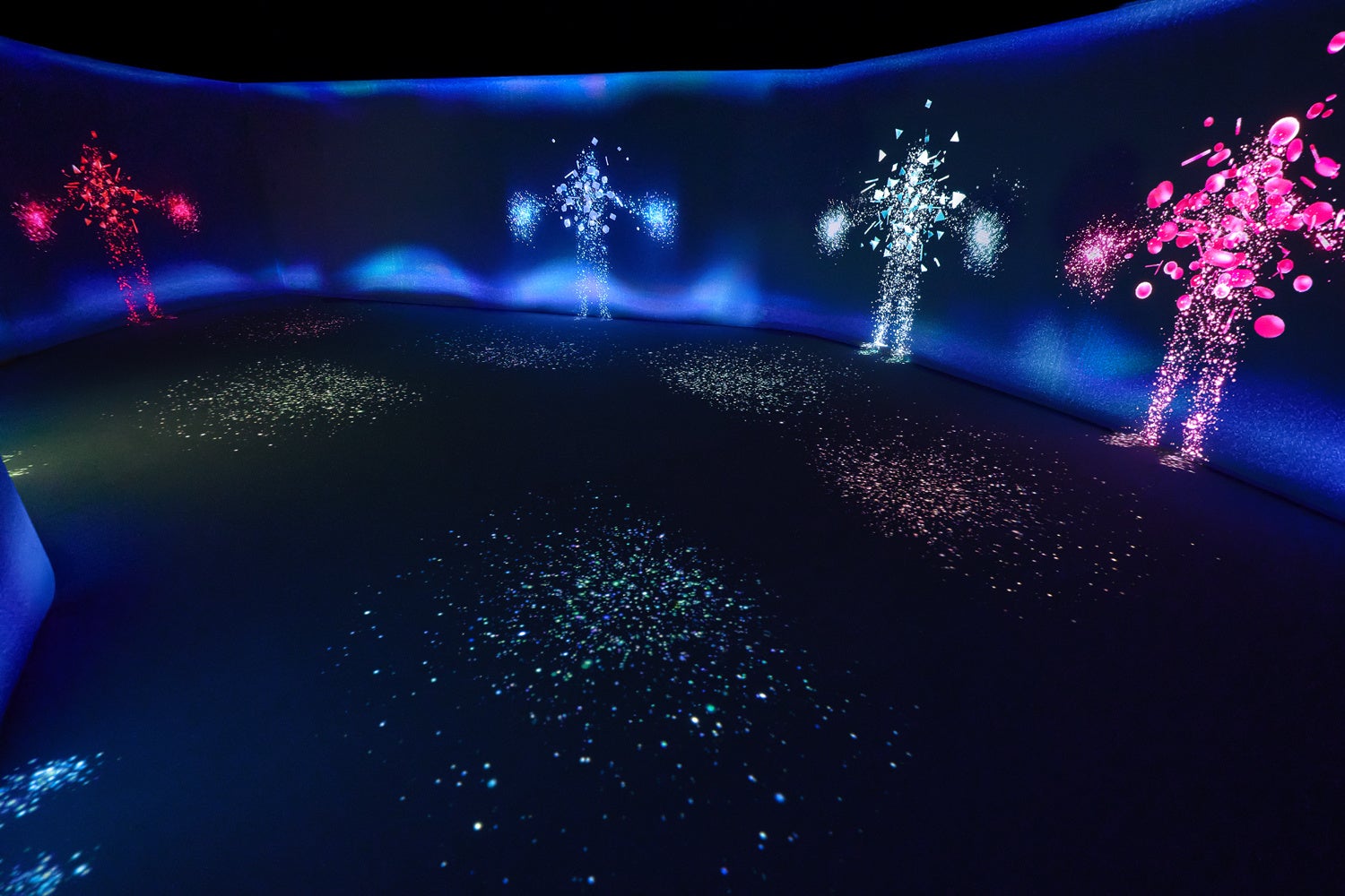 4th Field「IMMERSIVE(イマーシブ)」は、360度の映像と音に包まれる没入型インタラクティブ体験です。360度の映像プロジェクターと人感センサーが連動し、身体の動きに応じて映像と音がリアルタイムに変化します。体験は粒子状のアバターとの対話的なウオーミングアップから始まり、全11種類の中からランダムに出現する3つのゲームに挑戦いただきます。さらにフィナーレでは体験者全員で空間全体を動き回ることで、映像が変化し、その日その回限りのデジタルアートが完成します。
