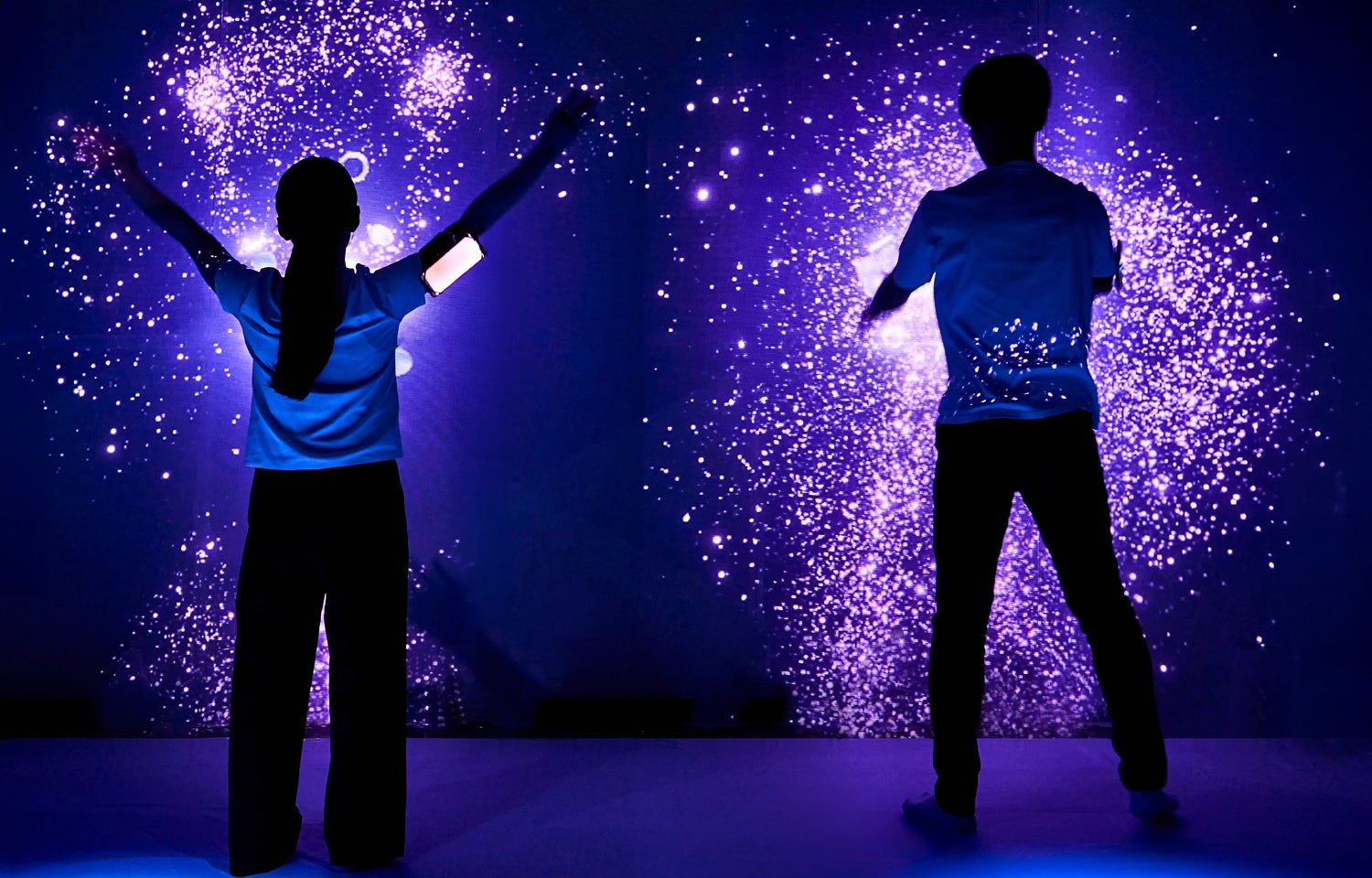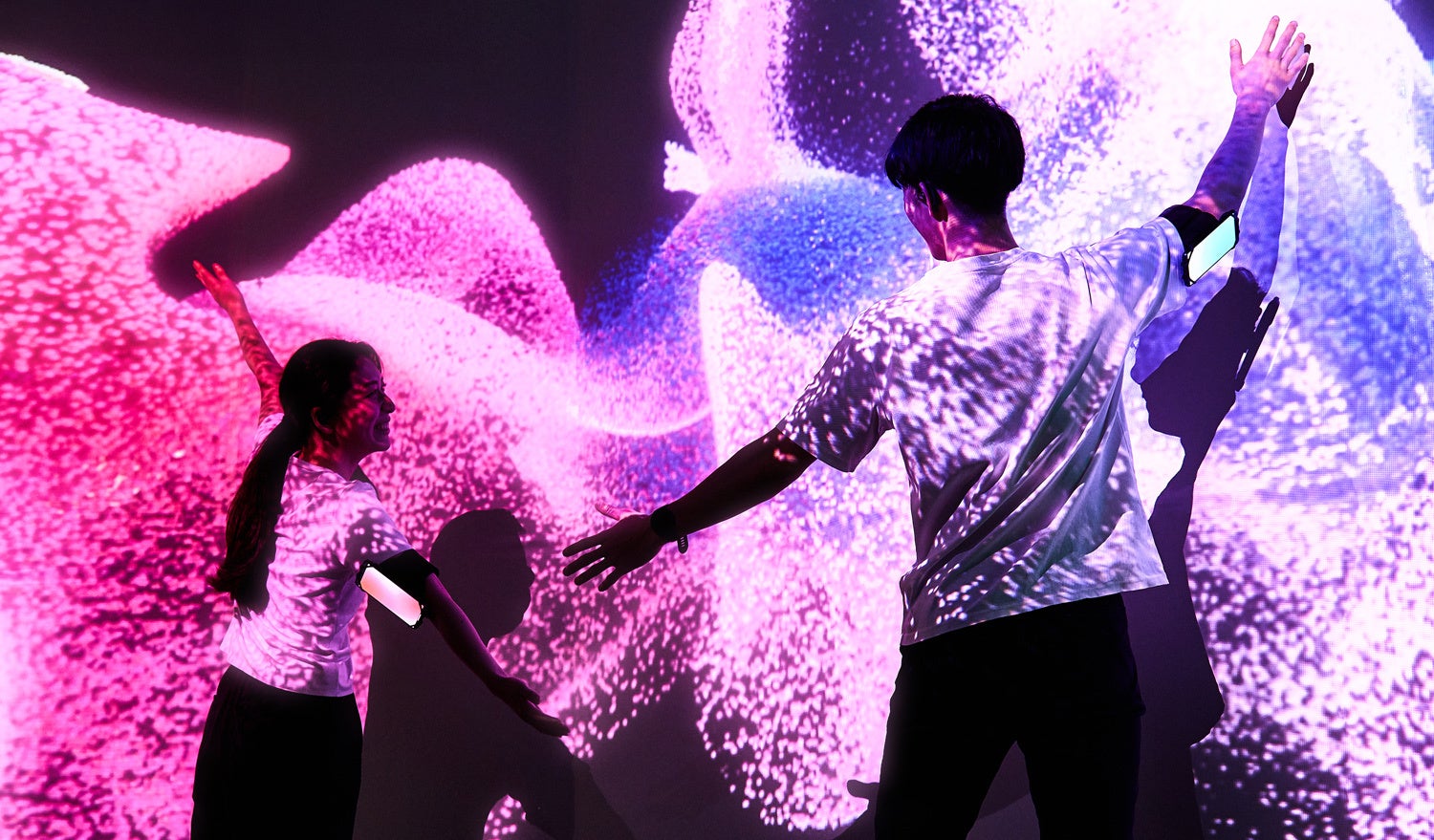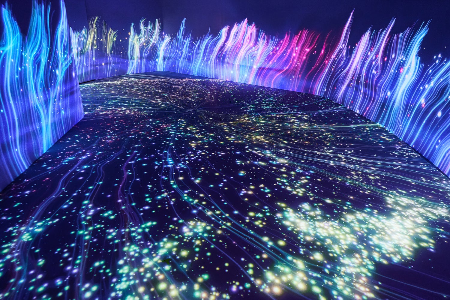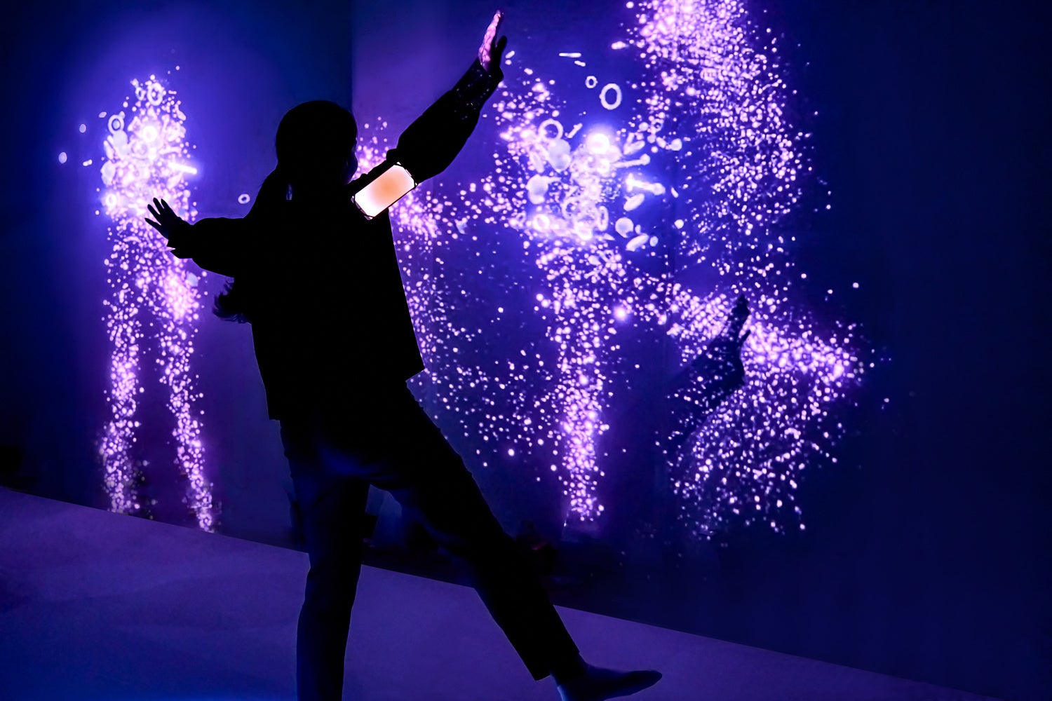 4th Field「IMMERSIVE(イマーシブ)」は、360度の映像と音に包まれる没入型インタラクティブ体験です。360度の映像プロジェクターと人感センサーが連動し、身体の動きに応じて映像と音がリアルタイムに変化します。体験は粒子状のアバターとの対話的なウオーミングアップから始まり、全11種類の中からランダムに出現する3つのゲームに挑戦いただきます。さらにフィナーレでは体験者全員で空間全体を動き回ることで、映像が変化し、その日その回限りのデジタルアートが完成します。
