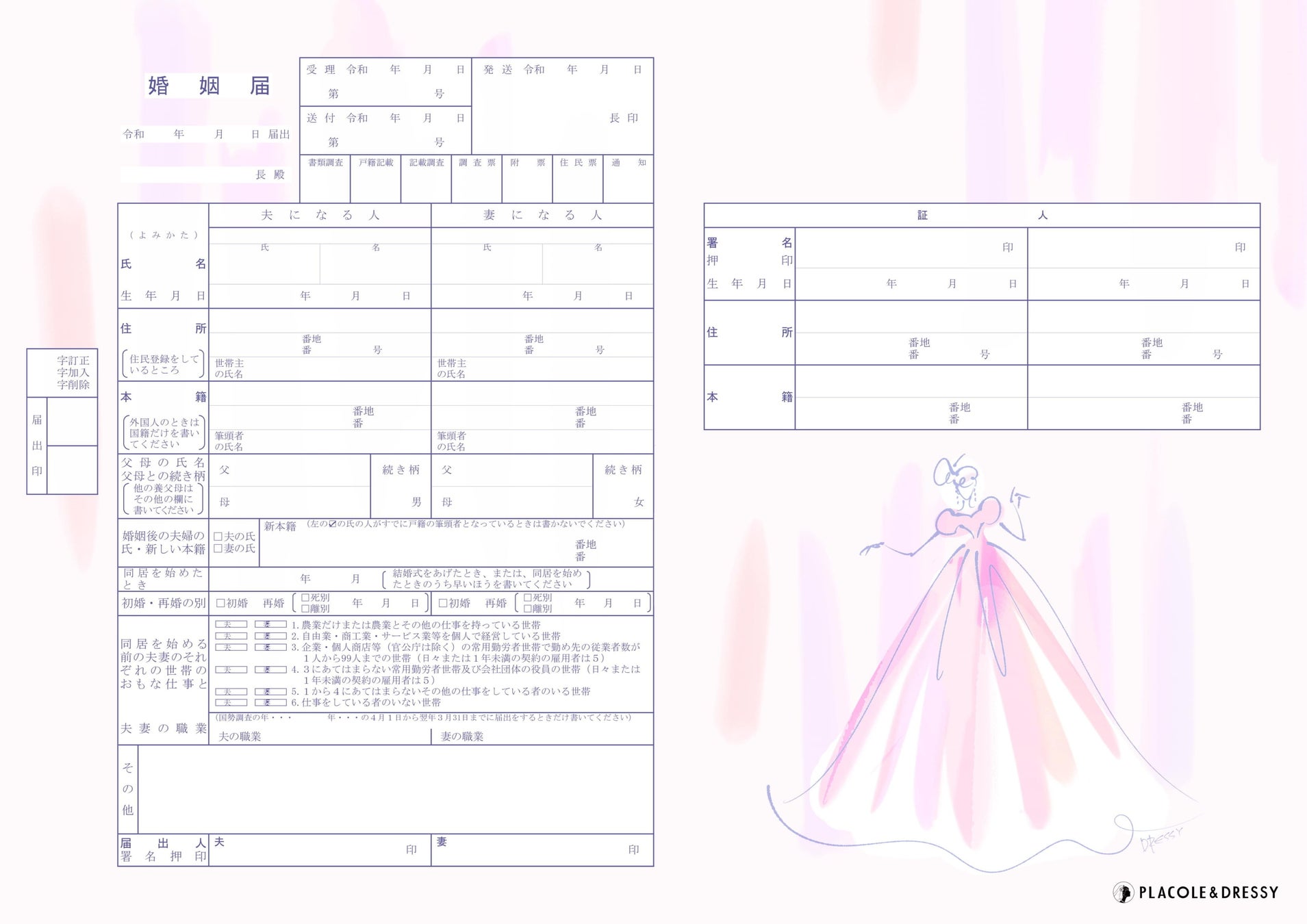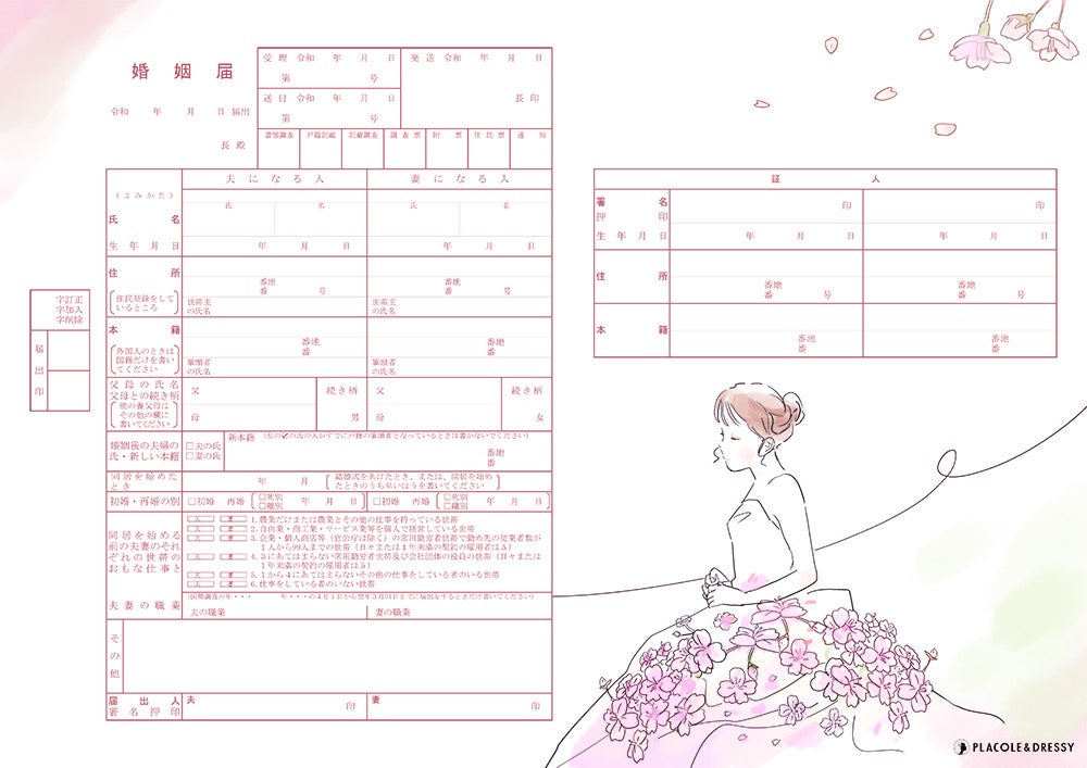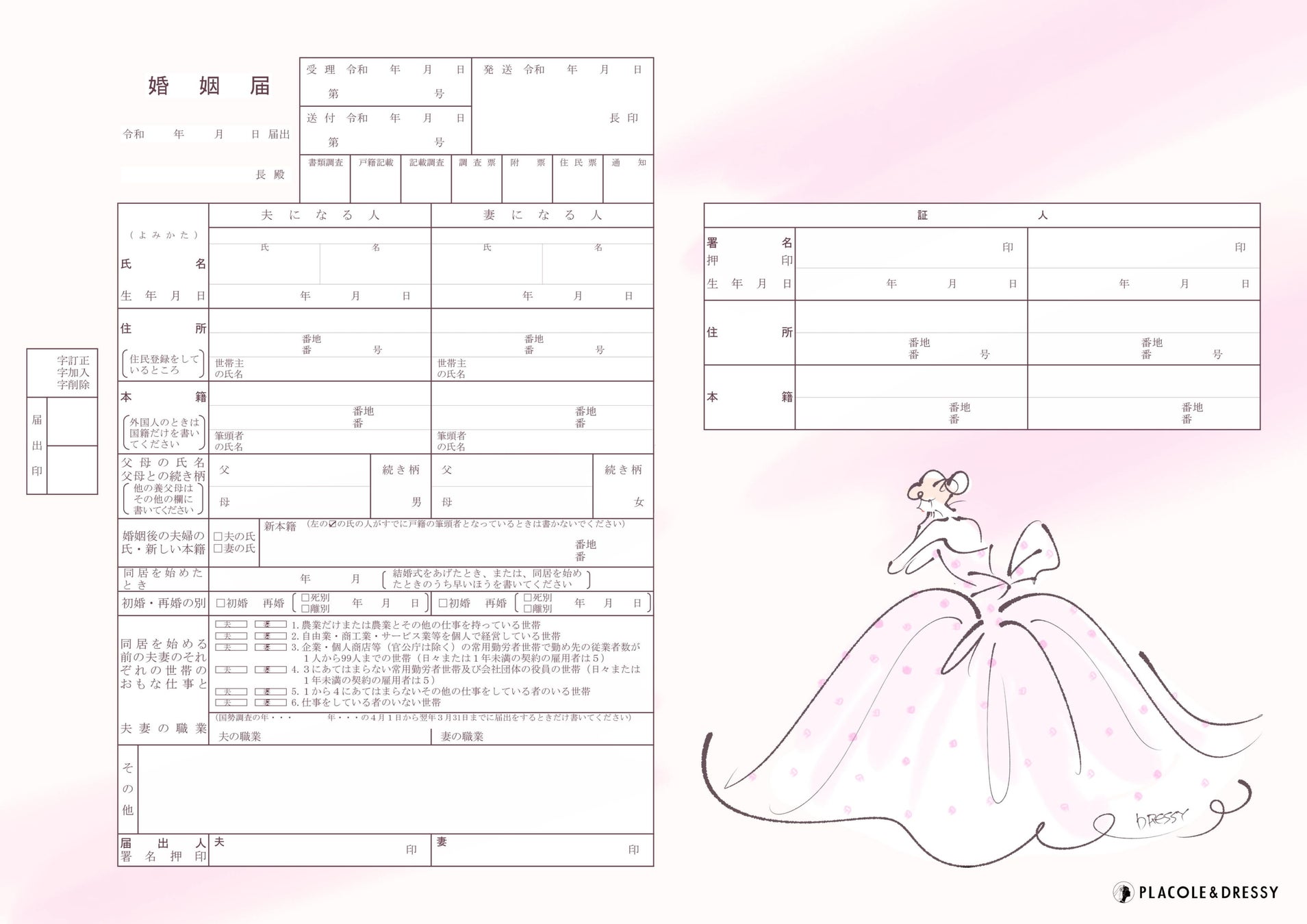 【無料DL】PLACOLE&DRESSYオリジナル 『プラコレ婚姻届』にデザインが登場!新たに4月ならでは幸せのクローバーやウェディングドレスの婚姻届など、7デザイン追加公開しました。