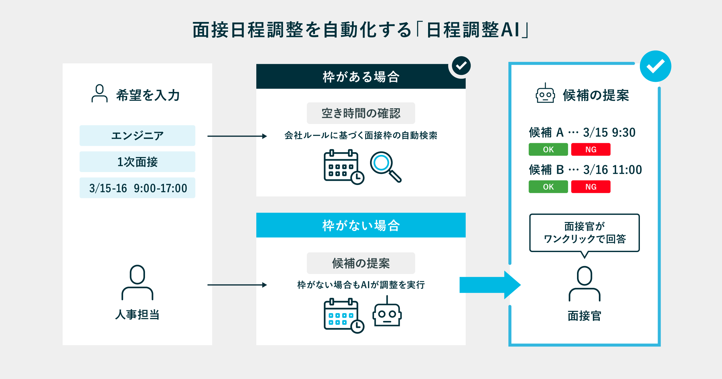 面接官はAIから提示された候補日時について、ワンクリックで調整可否を回答できます。複雑なコミュニケーションを必要とせず、迅速な意思決定が可能になります。