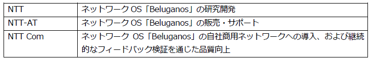 NTT Comにおけるネットワークサービスへの導入を想定した検証を通じ、高い信頼性が確認できたことから、ホワイトボックス装置と組み合わせ、NTT Comの商用ネットワーク基盤へ2023年3月31日より導入し運用を開始するとともに、「Beluganos」の販売・サポートをNTT-ATより2023年3月31日から開始します。