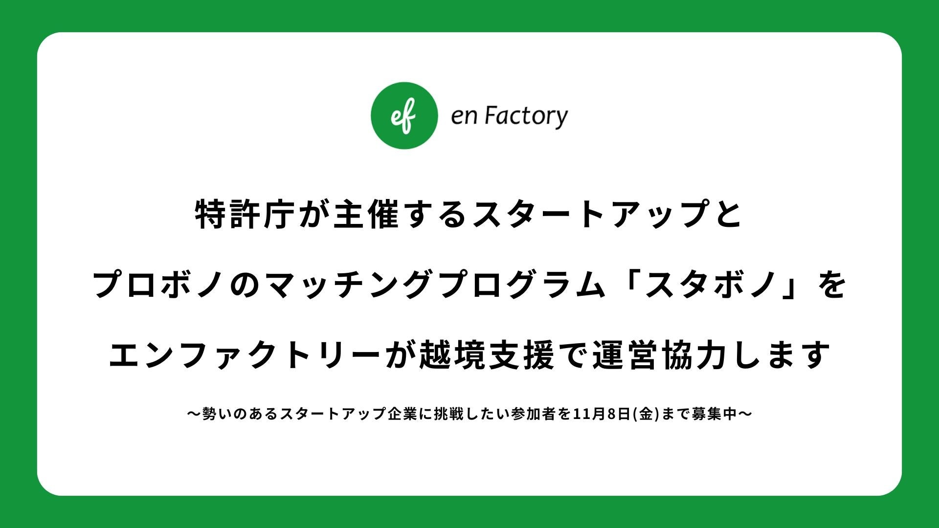 株式会社エンファクトリー(東京都千代田区、代表取締役:加藤健太)は、特許庁が主催するスタートアップとプロボノのマッチングプログラム「スタボノ」(URL:https://youtrust.jp/kanau/47)の運営協力を行うことをお知らせします。