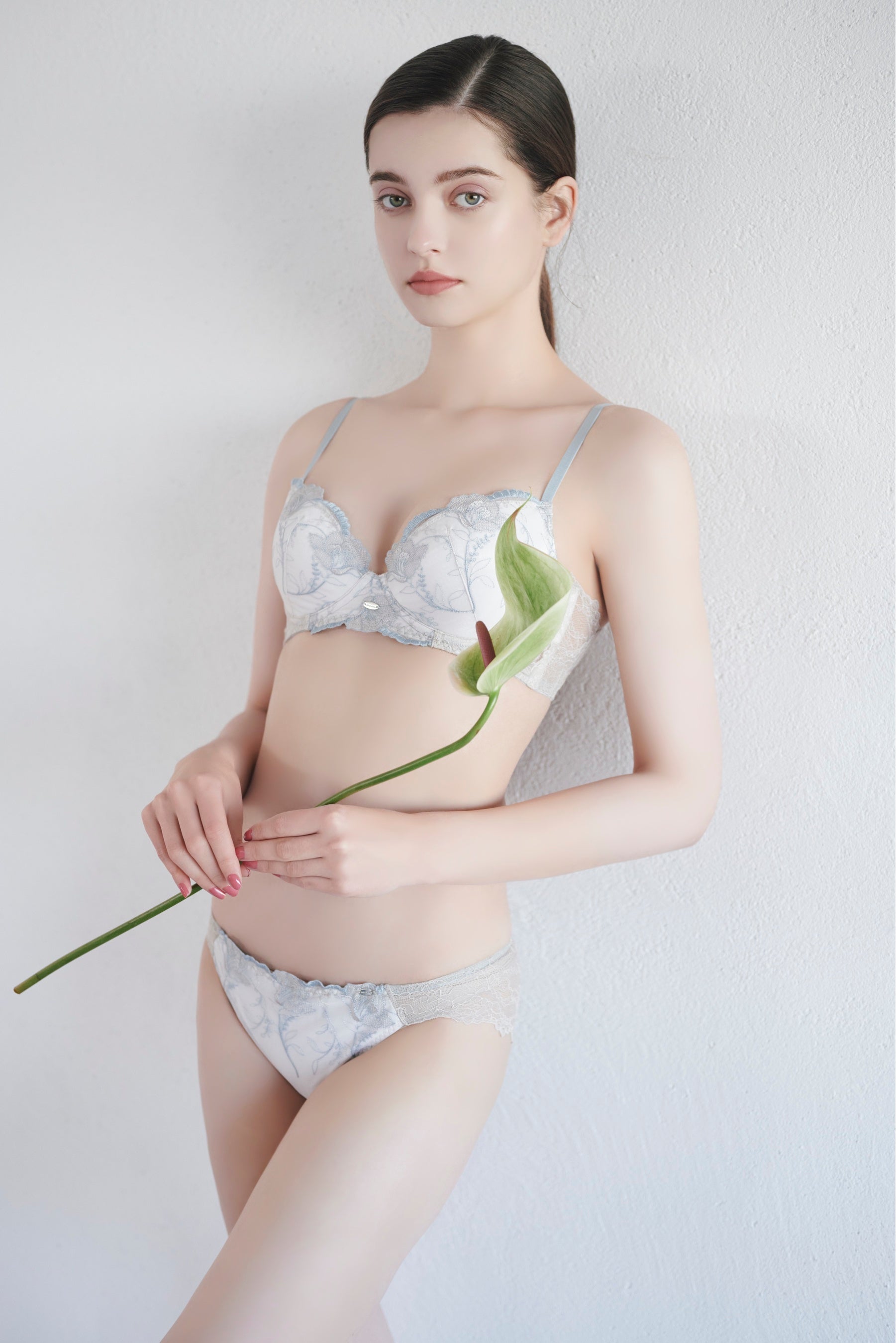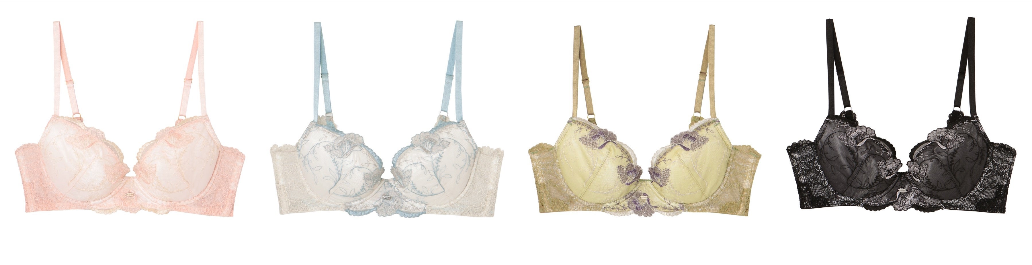 緩やかにカップを舞う線描きの花刺繍。風に揺らめくアザレアの花が、儚く甘い恋の記憶を呼び起こす。カップ上辺は、2色の糸を用いた花びらの輪郭がデコルテに柔らかな影を落とします。パーソナルカラーに合わせてあしらったロゴプレートが、肌色を美しく魅せるアクセントに。少女のようなピュアさを演出する4色展開。