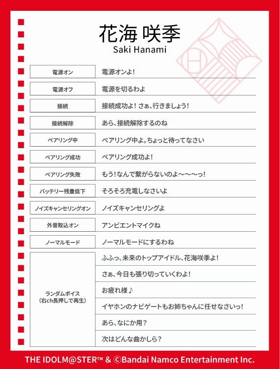 イヤホンの起動/終了や端末との接続状況をお知らせする「ボイスガイダンス」と、いつでも好きなタイミングで聴ける「ランダムボイス」を搭載。あなたの担当アイドルはどんな言葉をささやいてくれるかな?