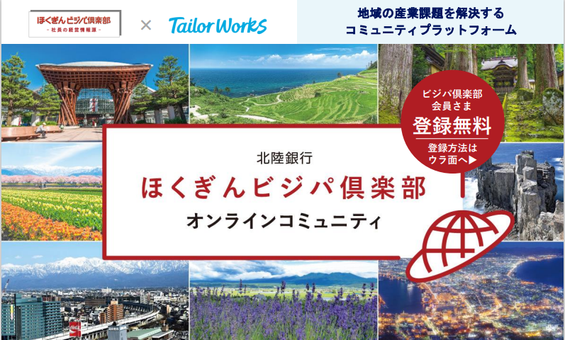 北陸銀行(頭取 庵 栄伸)では、法人向け会員制サービス「ほくぎんビジパ倶楽部」の新コンテンツ「オンラインコミュニティ」を、コミュニティプラットフォーム「Tailor Works」上で取り扱いを開始いたします。