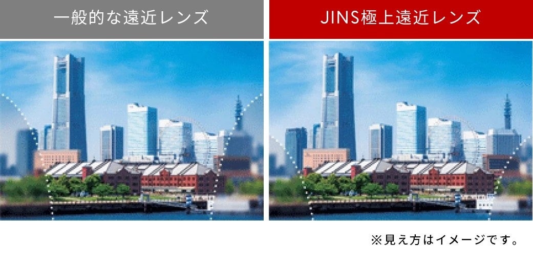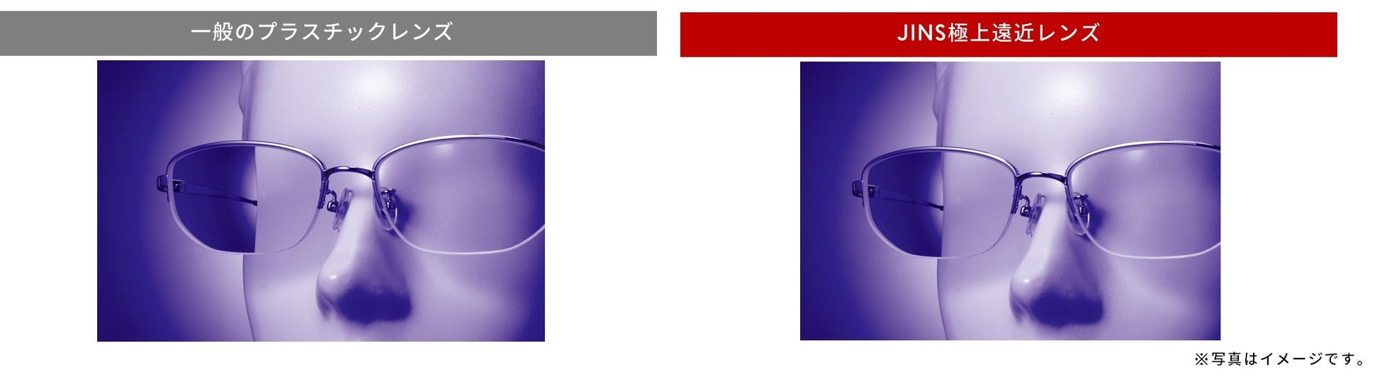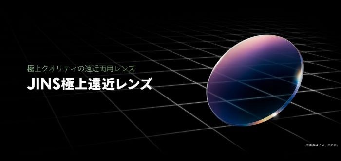 このような背景から既に遠近両用レンズをお使いの方はもちろん、初めて装用する方にも違和感なく使い続けていただきたいとの思いから、極上クオリティの遠近両用レンズ「JINS極上遠近レンズ」を販売します。世界最高屈折率※1.76のレンズと、両面累進および両面非球面の設計を採用。一般的な遠近両用レンズに比べ揺れや歪みを軽減することで、遠くから手元までの視界をより広くクリアにした、快適な使い心地となっています。また、レンズの厚みやフェイスラインのへこみを軽減し、美しい見た目にこだわる方のニーズにもお応えする商品となっています。