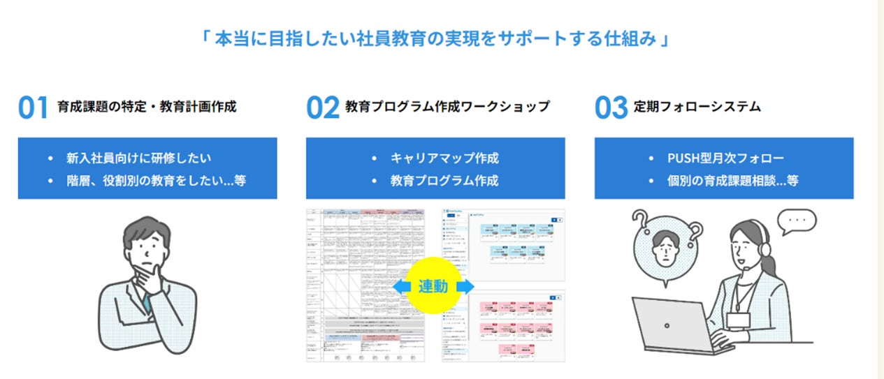Smart Boardingを導入して終わりではなく、自社プログラムや実践トレーニングを通して、お客様の人財育成や社員教育の実現に伴走しています。また専任担当が、各階層や役割別に求める人材像の具体化や社員教育課題の特定、学習プログラムの作成までワンストップでサポートしています。導入企業の成長ビジョン実現の為に必要な「求める人財」を育てるオリジナル教育プログラムを作成し、"社員一人ひとりが自ら学び始める組織づくり"への徹底伴走が高い評価をいただいています。